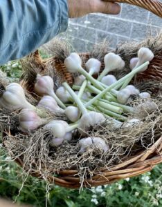 I do know how to grow things. That is because I have a browser and know how to type. So I looked up when to harvest garlic. And that would be about three weeks after you pick the scapes (I didn’t pick the scapes) and if you don’t pick the scapes (I didn’t) you wait until they are pointing straight up. They start out gracefully curved under like a shepherd’s crook. Problem was, I was going to be gone for a while, and I didn’t want to miss my garlic window. I looked every day, and the scapes were unfurling and starting to point up. Most of them. Just in time! About 3/4 of them were pointing straight up and the remainder were at least a little aroused.