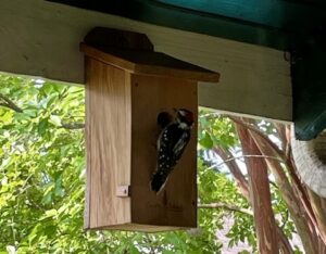 And now here’s this downy woodpecker whacking away at the entry hole. My first impulse was to scold him for messing with the dimensions (perfect for chickadees and nuthatches). At this point I don’t know if he’s vandalizing or gentrifying.