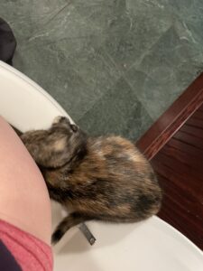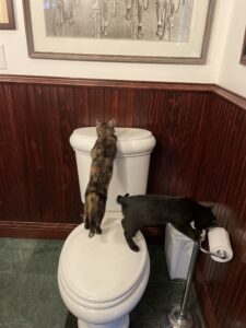 Well, all of this was more attention to cat poop than I had been accustomed to, but within the bounds of reason. Unfortunately, Wally is also interested in mine. Let me tell you something: the first time you sit on the potty and feel whiskers at your nethermost nethers, you mind goes a dozen places at once, none of them good. It never occurred to me that there was room behind me for an entire cat to stick her nose in what I still like to think of as my personal business, thank you.
