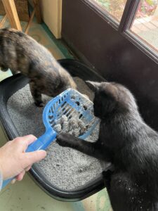 The experts say you should have at least two litter boxes for two cats, if not a third. I thought that might be excessive, but now I know why. You need to fake them out with one box while you quick-scoop the other one. Both cats seem to take offense at the poop scoopage, and keep trying to nab it back out of the scoop.