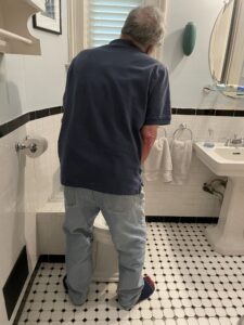 I had a little problem in my fifties wherein nothing was wrong with my bladder per se, except that fibroids were lounging against it like fat men on a cheap air mattress. Since those went away (I’m told they’re still there, but have lost weight) I’ve been pretty sound. The weird thing though is I can be out for a good long walk—miles and miles—without any sense that I needed to pee, or at least needed to pee right then, and then I come home and meander toward the bathroom and suddenly my Toilet Proximity Alarm goes off and it’s all Whoop! Whoop! Batten down the hatches! and I’d better have all the buttons and zippers figured out before I get in there or there’ll be hell to spray.