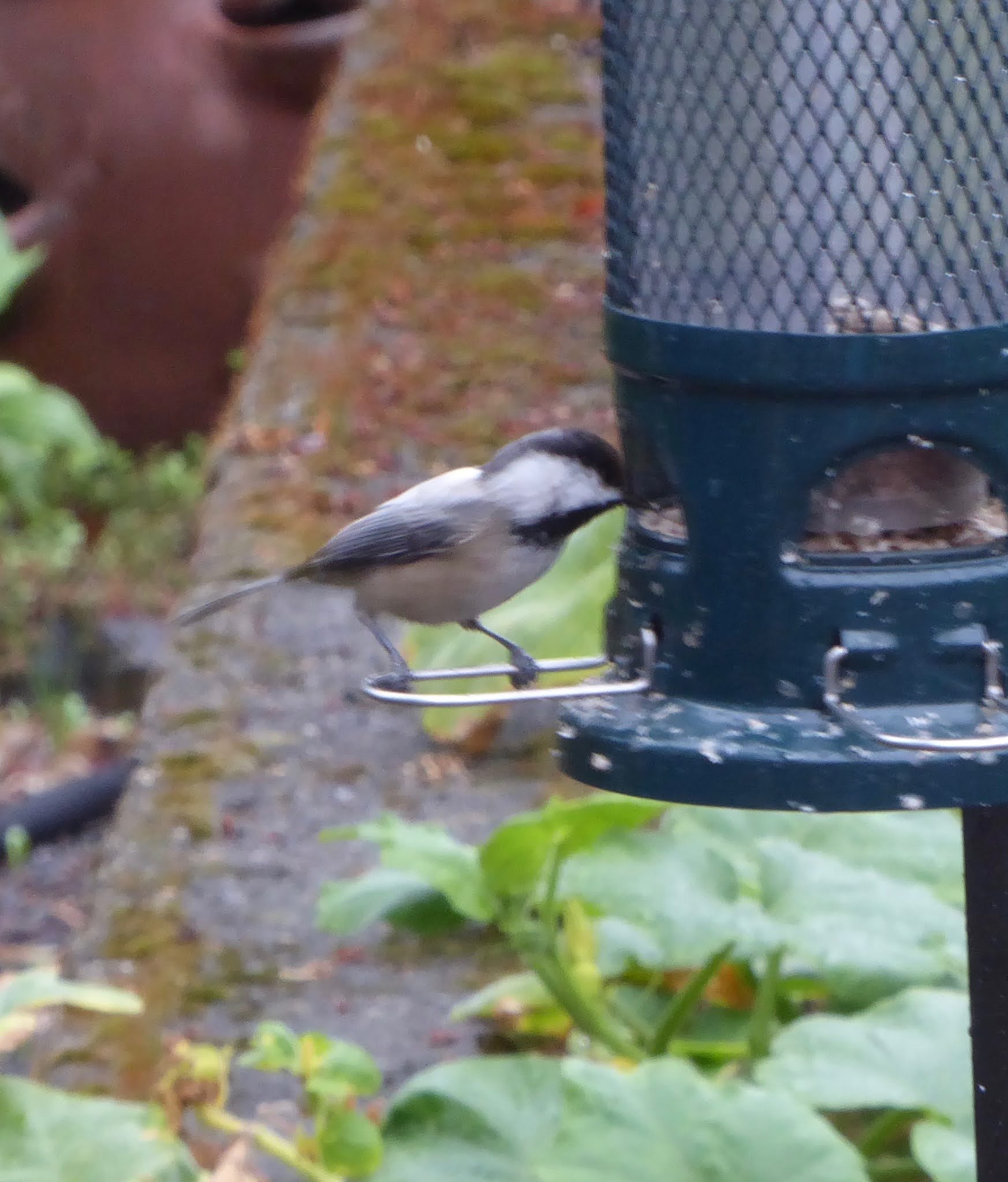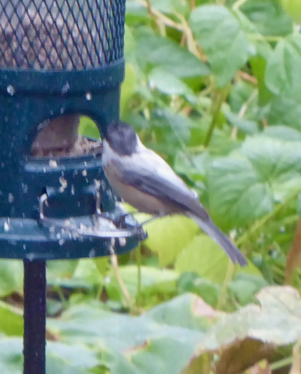So now I have at least two standard chickadees loitering around. They’re identical. But now there’s a new, third kid in town. A distinctive chickadee. It’s almost all white on the back. Oh my god.