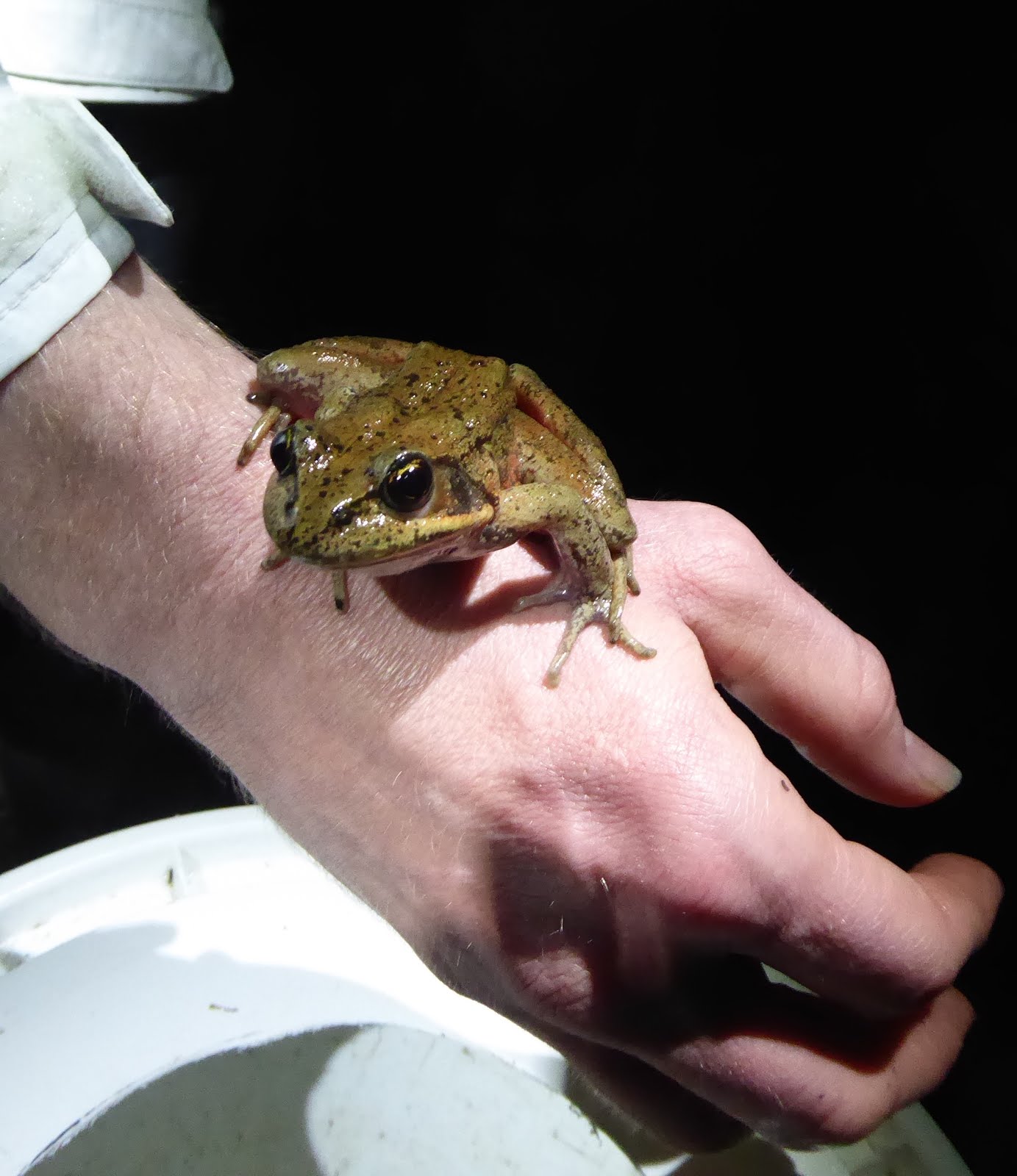 I’m the co-captain of the Monday team. That’s not as fancy as it sounds. That means the five percent of the time the real captain, Captain Jane, can’t make it, my sorry fanny is enlisted to gather the troops, locate the buckets and safety vests, apologize all night long if the frogs don’t show, and possibly screw up the data log. But the Monday Nighters are forgiving sorts. The Monday Nighters rock.