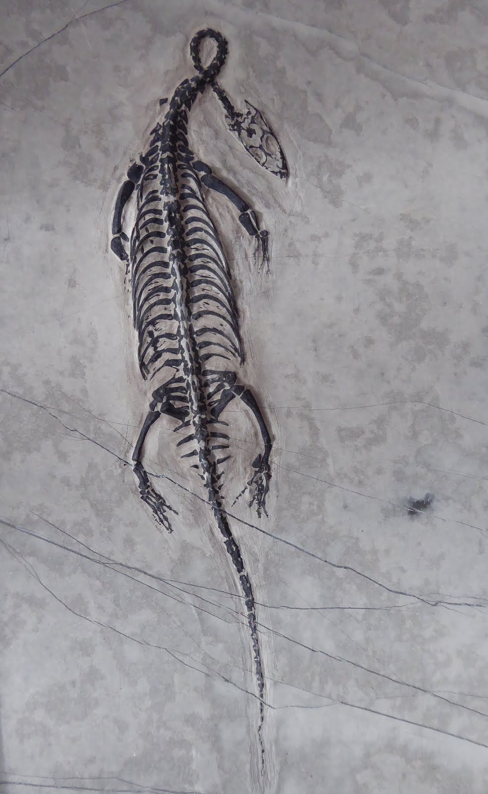 This particular kind of fossil is really common. Many of them display the pretzeled neck that you see on poor Mr. Sneffels. It was explained to me that it is a natural event that happens upon death, some sort of rigor mortis thing, although it seems equally likely to me that the unfortunate lizard might have just been looking back to see what got him.