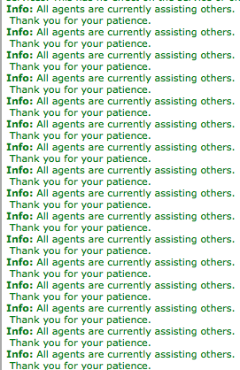 Every two minutes, I got a slightly different version of this message and then–1-1/2 hours in–the “agent” terminated the chat. Would I like a transcript of our chat? Oh yasss. Yass indeedy, I would. I’ll need it for the murder trial.