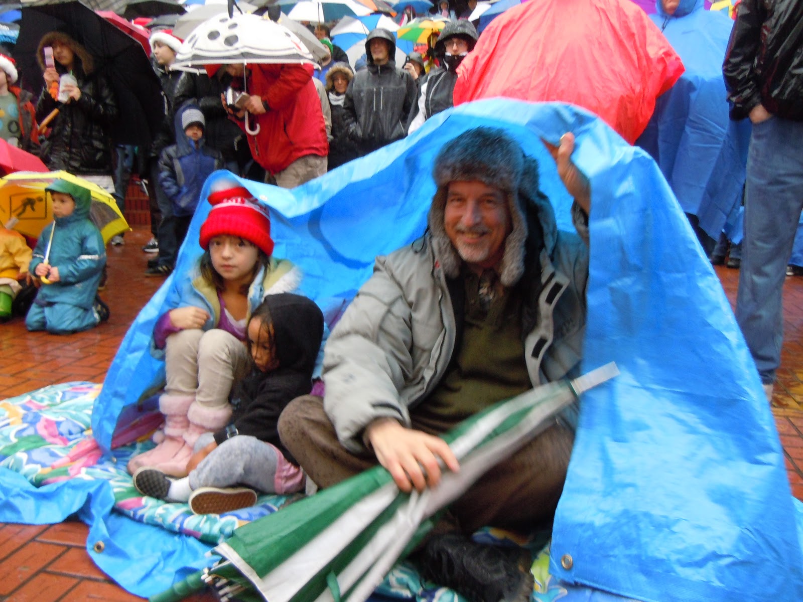 There’s an attempt to get the crowd to sing along, only to our horror it is not “along,” but a cappella, our verse framed but not accompanied by tubas. The conductor is under the canopy and hard to see, and the pace the tubas have set for us is glacial. The angels we could hear on high, who couldn’t see the conductor at all, had to wing it. Other factions selected their own tempos according to how cold they were, and by the time heav’n and nature sang, the group closest to the conductor had been lapped twice. There was nothing professional about it, any of it, and when the conductor remembered an interesting historical footnote and laboriously turned around to inform us of it, I looked back at the audience: every one of us wet as muskrats, children stomping puddles as quietly and decorously as possible. You could try to think of rain as God’s tinsel if you want, but it’s cold, and hard to festive it up. Yet everybody is smiling patiently, jiggling for heat, because not one would deny a kindness to an old tuba player at the close of his life; it’s the bookend to our first Christmases, and it’s what we have to give. And when the tubas break out in the most magnificent hymn of all, a hymn with the majesty to match the tempo, there’s a moment in it: the soaring come and adore him, born the king of angels, the measure where your voice and your heart both break at once. That’s your childhood shining through the fracture. It’s okay to weep for it.