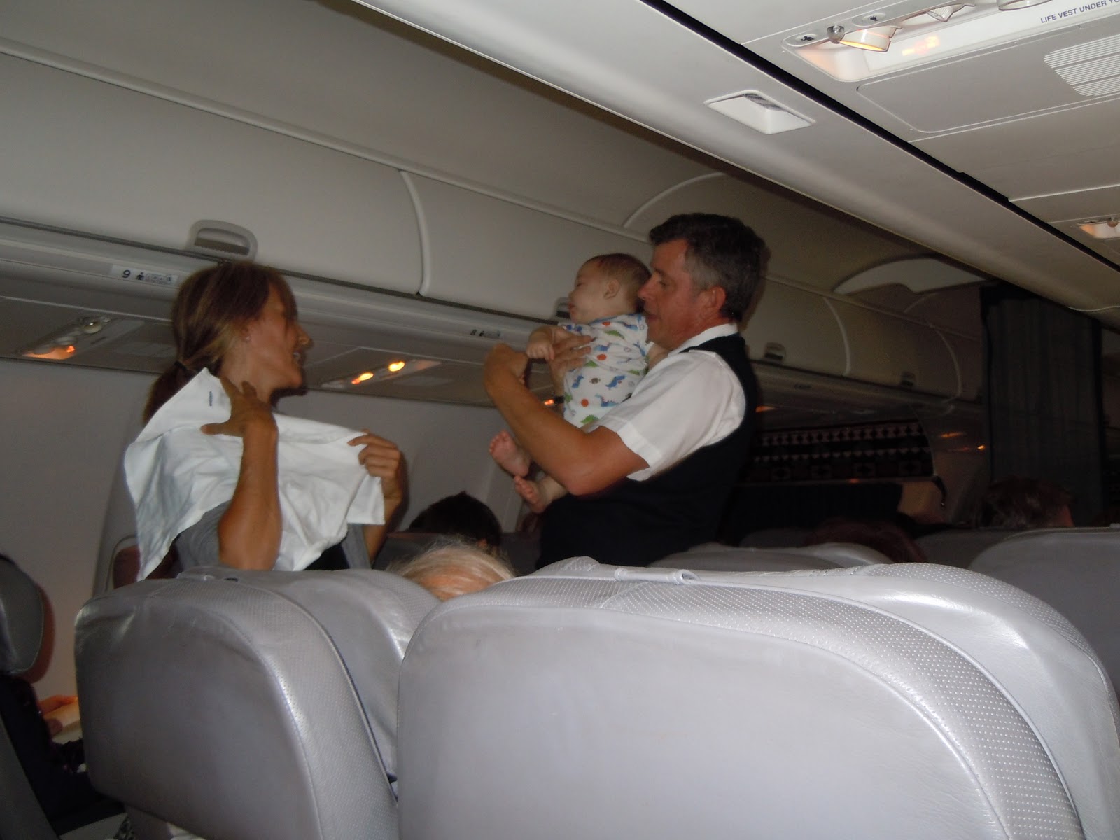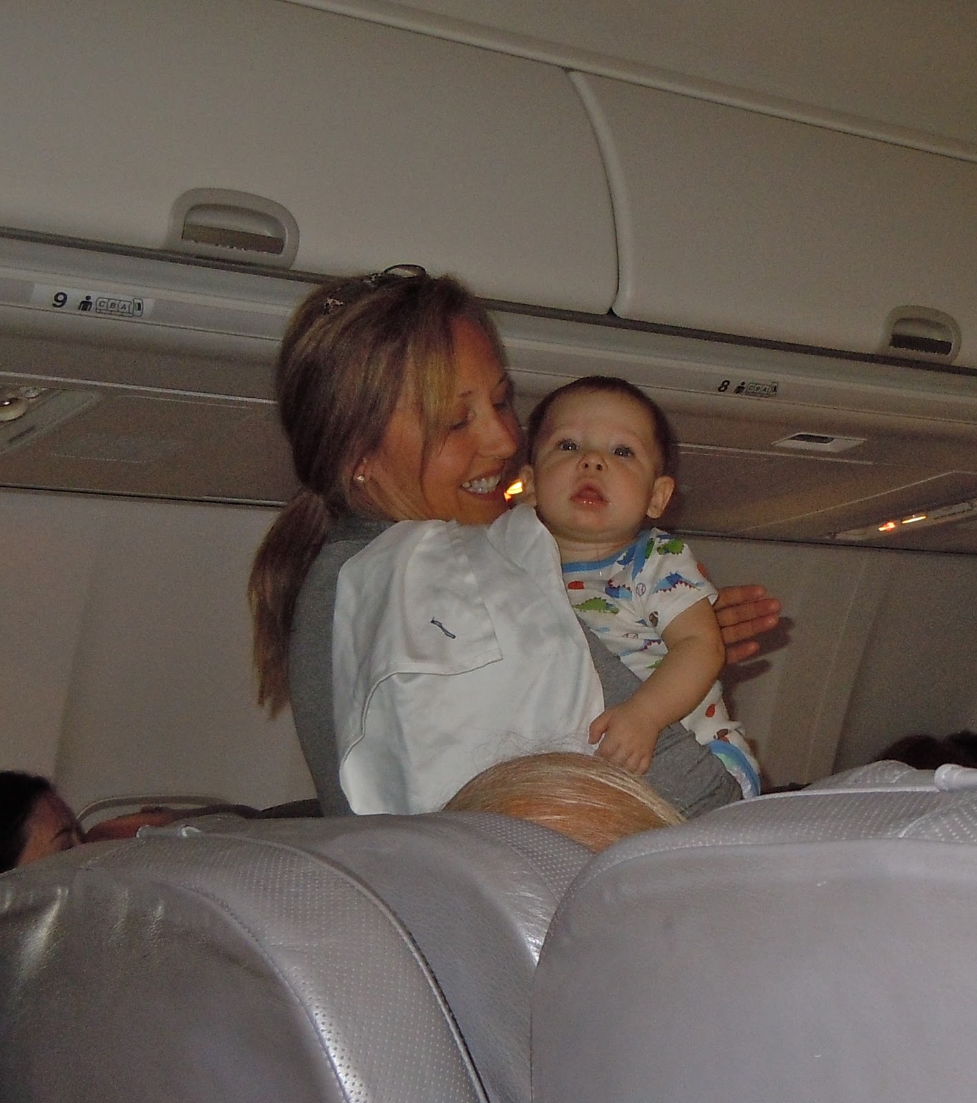 Two rows up, a beautiful woman asked to hold him, took over the easily-consoled baby and wrapped him in a dashing faux-leopard blanket. He was adjusted to full-view cooing position and handed around the plane. An old man in the next row demonstrated his foot-tickling expertise. The baby body-surfed around the cabin.