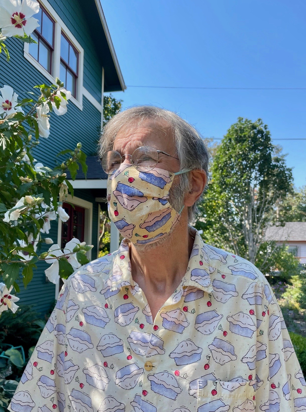 Dave and I were walking home, wearing our cotton masks (his matched his shirt, which can happen if the lady of the house made both the shirt and the mask). An old man was approaching us. He never said a word. But suddenly he looked up and started clawing at his own bare face, and spitting, and glaring. Was he ill? Should we do something?