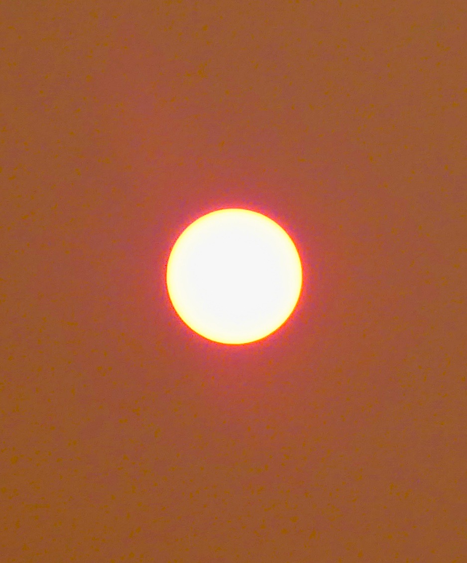 It’s actually kind of nice this morning. The wind has died down to nothing and so the smoke from the fires seven miles away is just sort of meandering over here and loitering rather than galloping in. It’s keeping us fully twenty degrees cooler than predicted, too. The humidity has gone back up, which is also good, and we’re anticipating not having to check our hankies for blood and crud any day now.
