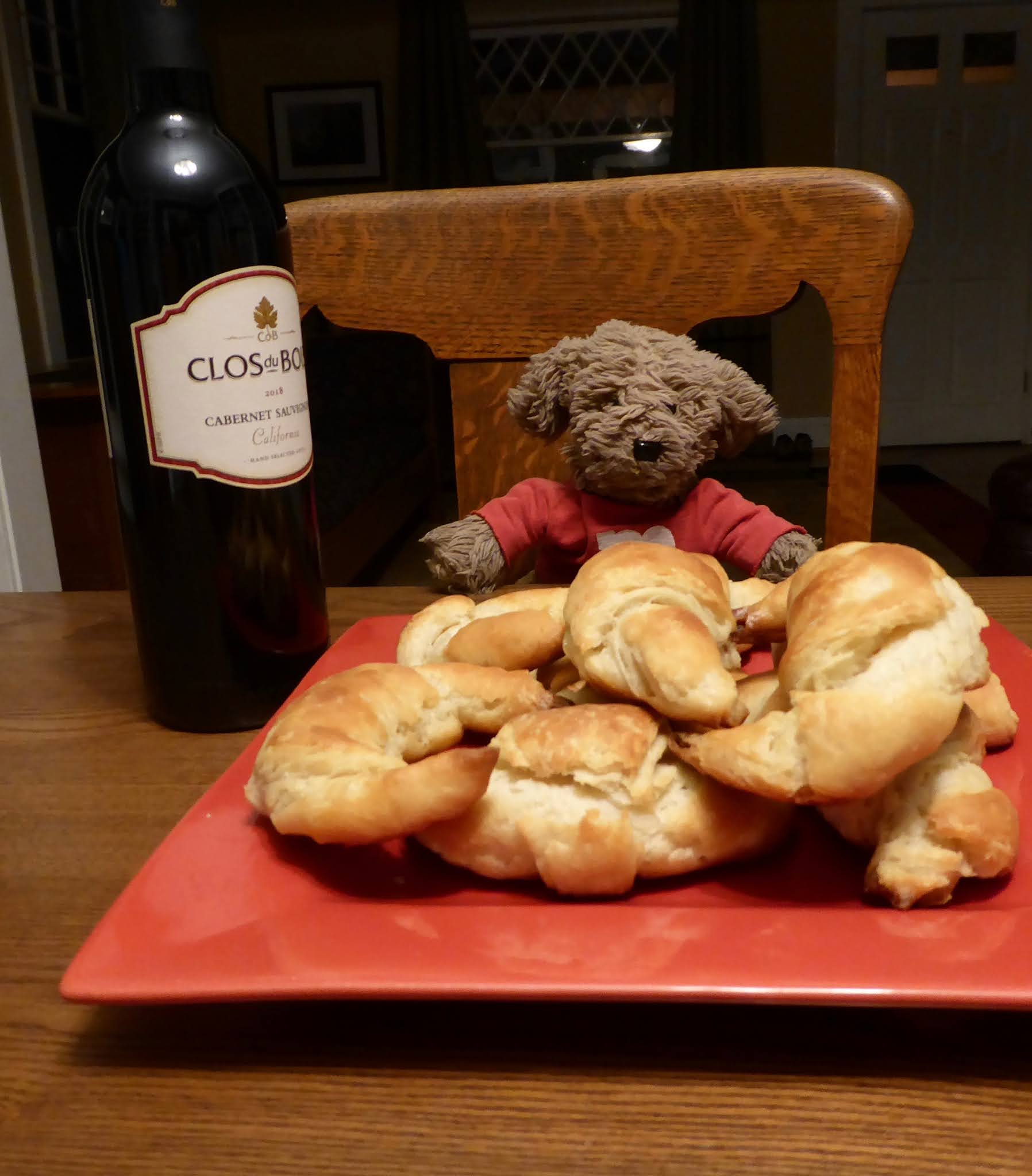 It’s my job to make croissants for family feasts. I’m not much of a baker, but I get the nod in my family because basically no one else wants to bake at all. This year we had no prospects for a big Thanksgiving dinner and no real plans for ourselves, and that was okay, because Dave has never particularly like turkey anyway. He always made the turkey, and the stuffing, and the potatoes, and the side dishes, and the gravy, and the peeled prawns with tarragon mustard sauce, and a selection of Horse Doovers, and he opened the can of cranberry sauce and shlorped it onto the plate, but he always groused about the turkey (little ground bird humor, there) and wondered why we couldn’t have prime rib instead.