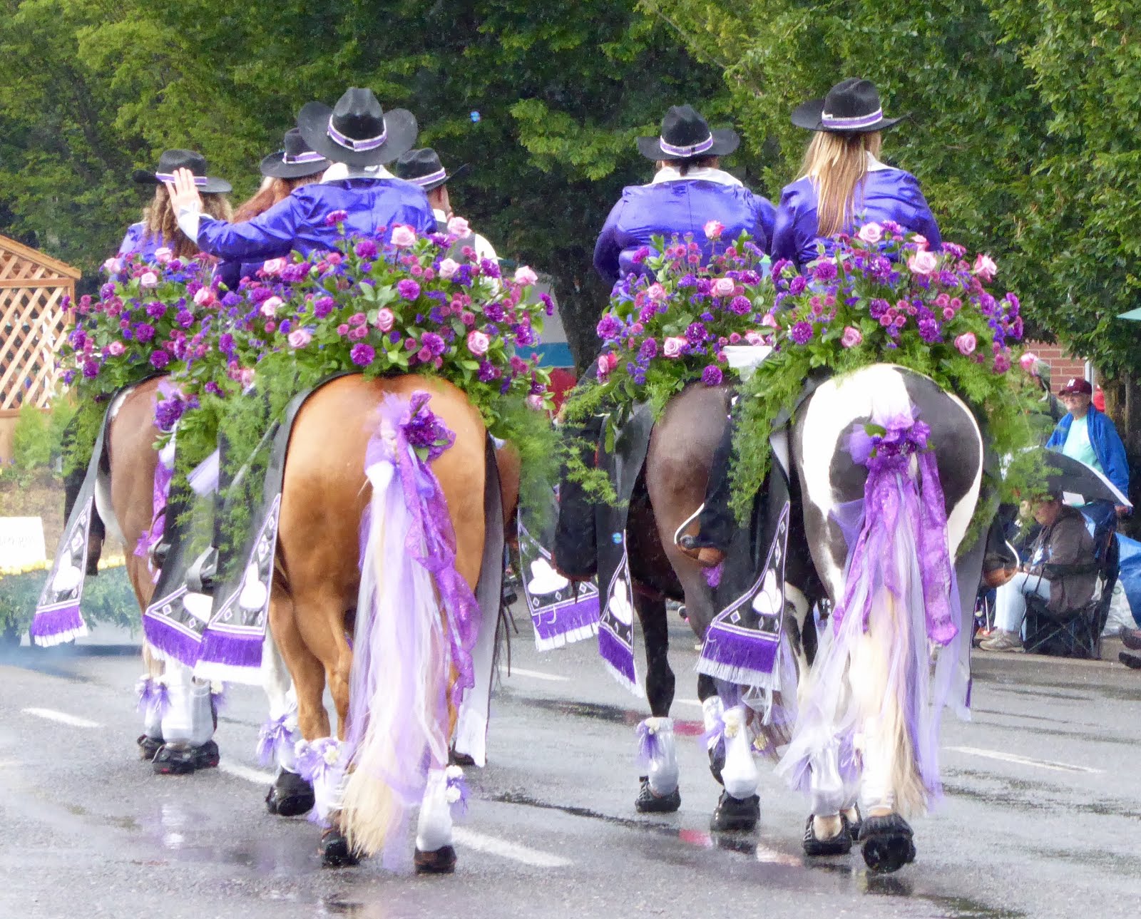 Then I saw the weather forecast. After eight weeks of sunshine, we were due for a decent downpour, last Friday evening. It was going to rain hard Saturday. Sunday it would begin to clear up again. Of course! What happens Saturday? Why, it’s the Rose Festival Parade! It was going to be wet horses, soggy princesses, and drowned tuba players all day long. Right on schedule.