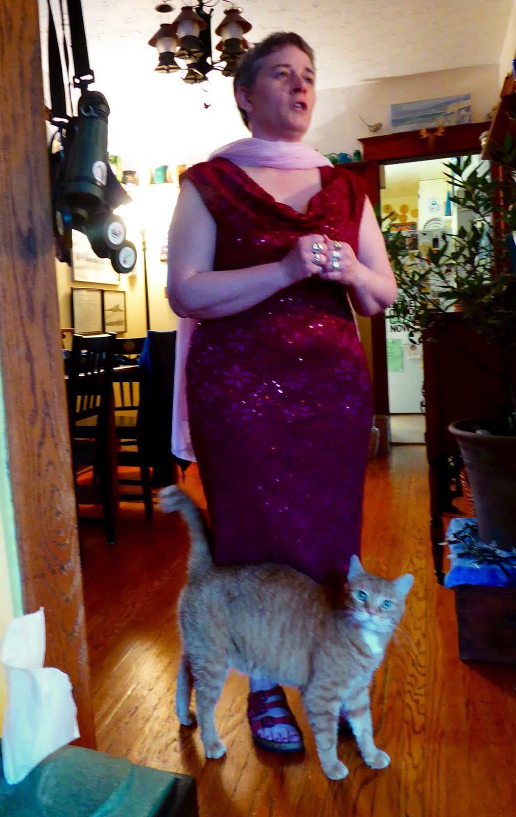 So does Kelly. How often do you get to follow up a nice dinner with a private, live performance of operatic quality from a small soprano in a spangly dress and Birkenstocks, accompanied by her cat Harry in a plaintive alto? I’ll tell you. Not often enough. But we did. Get your own friends.