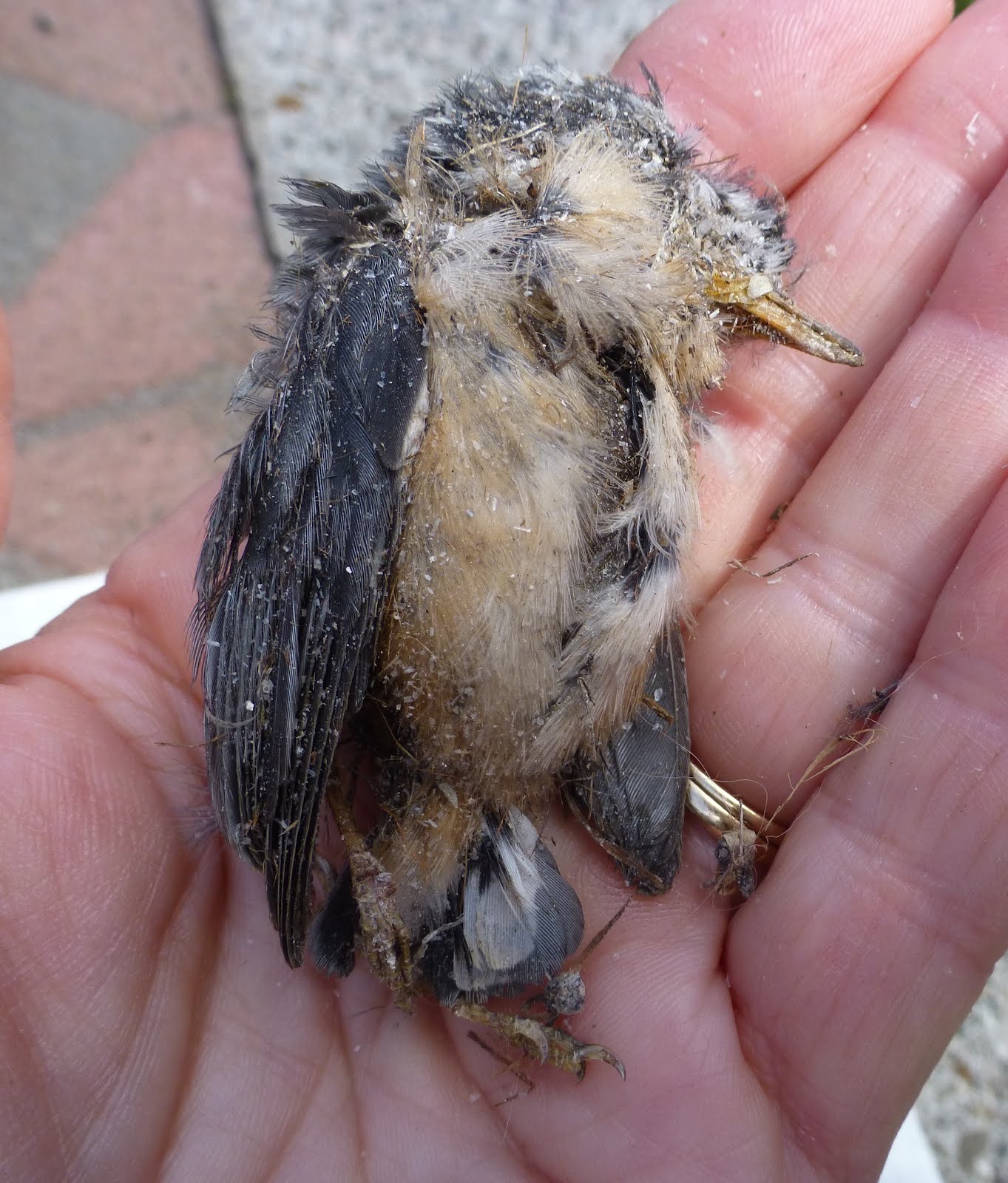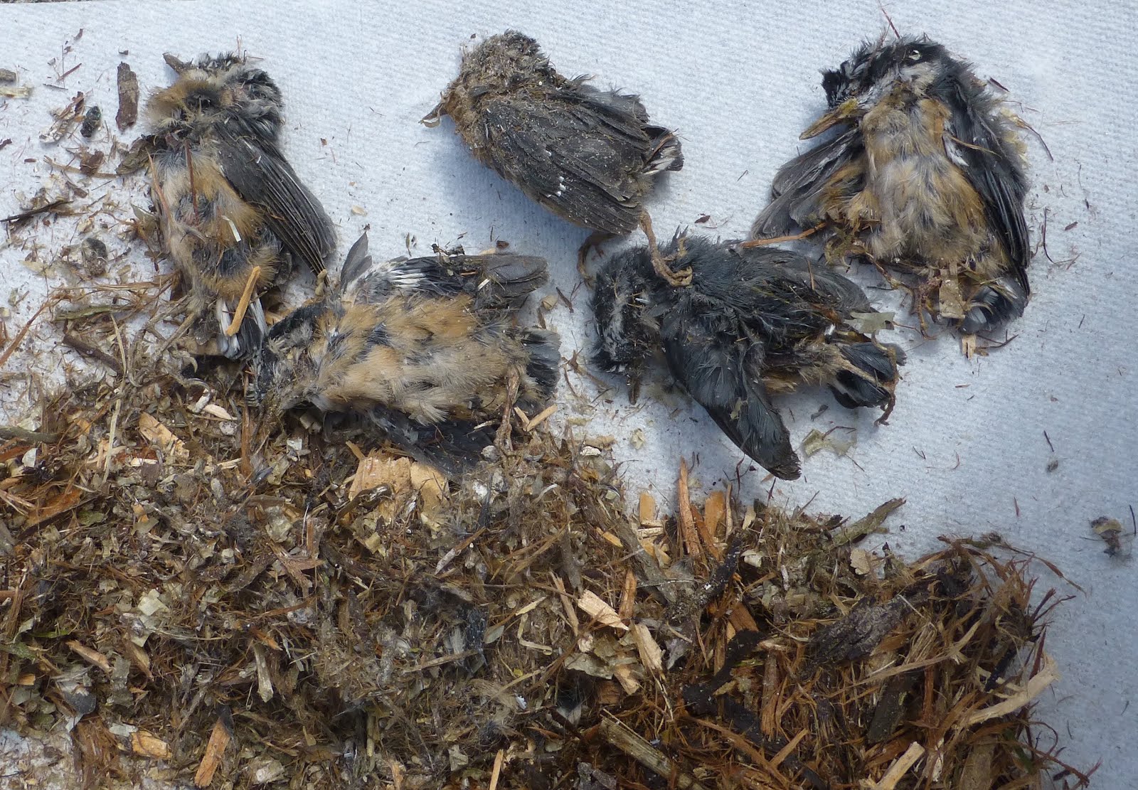 Five dead babies? Five. All feathered out but smaller than the two that actually left the nest. They were probably one or two days dead by the time the successful ones took off. And now it was over a week later. They hadn’t yet turned to goo, but I couldn’t tell much about cause of death. Could be a lot of things, I guess. The world, it must be said, conspires against baby bird survival.