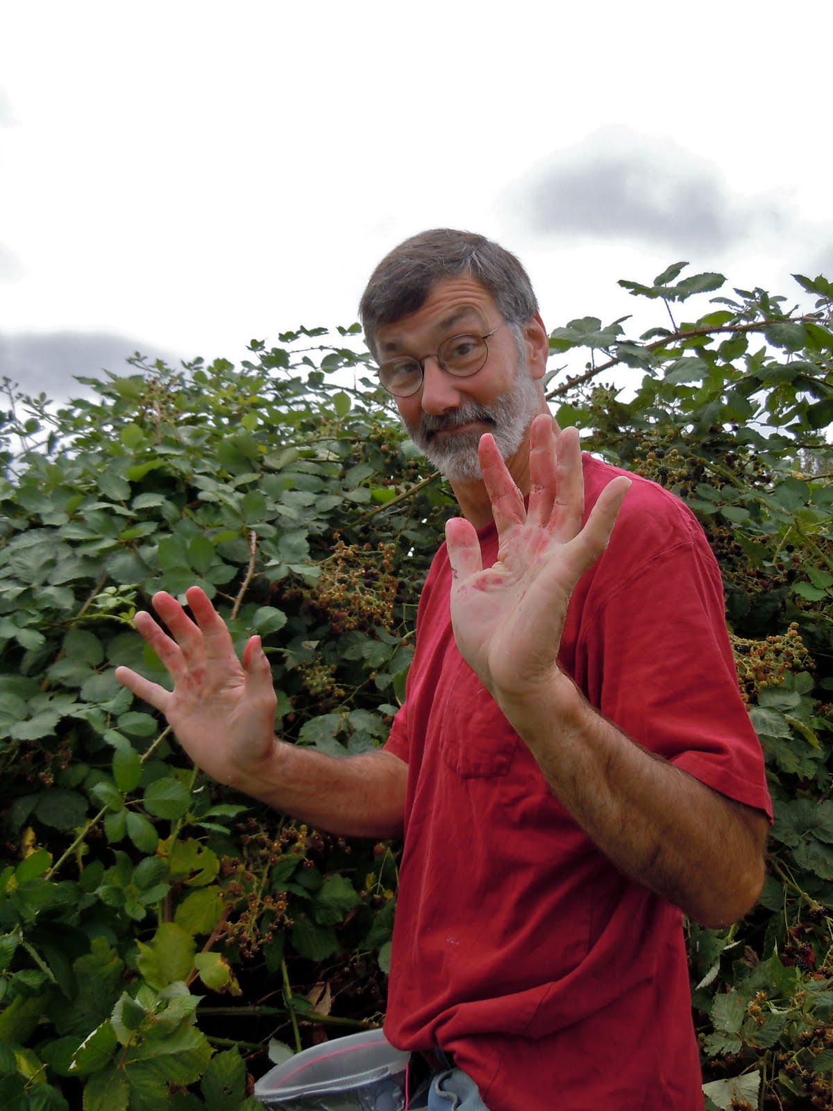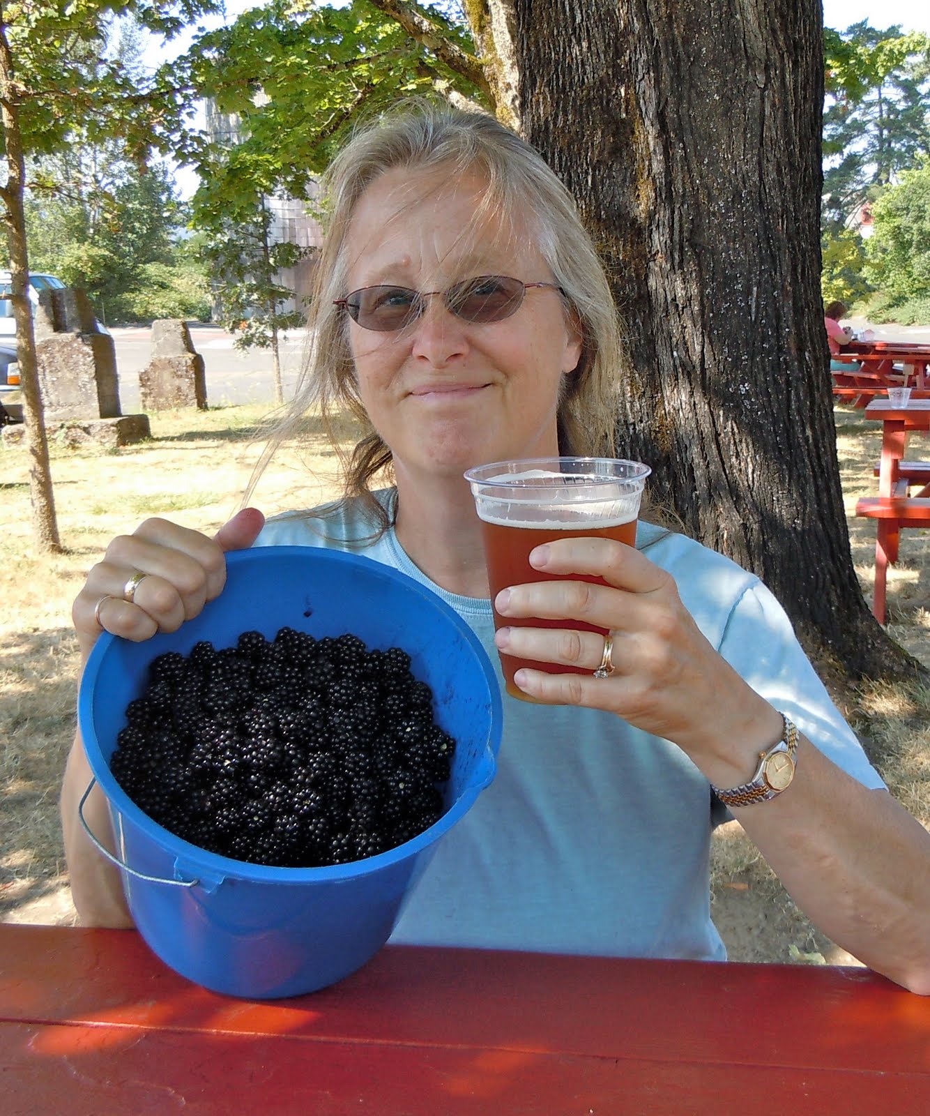 According to the OSU Agriculture Extension Service, there are two thornless varieties. They are located in Sasquatch’s back yard under a thick mulch of leprechaun poo. The rest of them are violent and sneaky and no fun to pick, but they can be tamed into a delectable pie, and every year I haul out the buckets and tell Dave to suit up and off we go. The juice gets all over everything, but it does mask the blood.