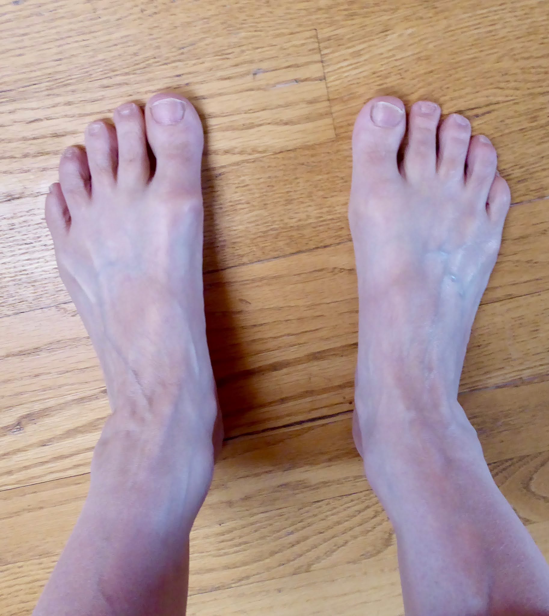 I believe they are not hereditary. But they are common. For the record, my bump has not gone away, but as you can see my feet are pretty straight anyway, and it was the OTHER foot that was starting to hurt–and now it doesn't. I don't even know if that bump IS a bunion but in any case that foot is not bothering me.