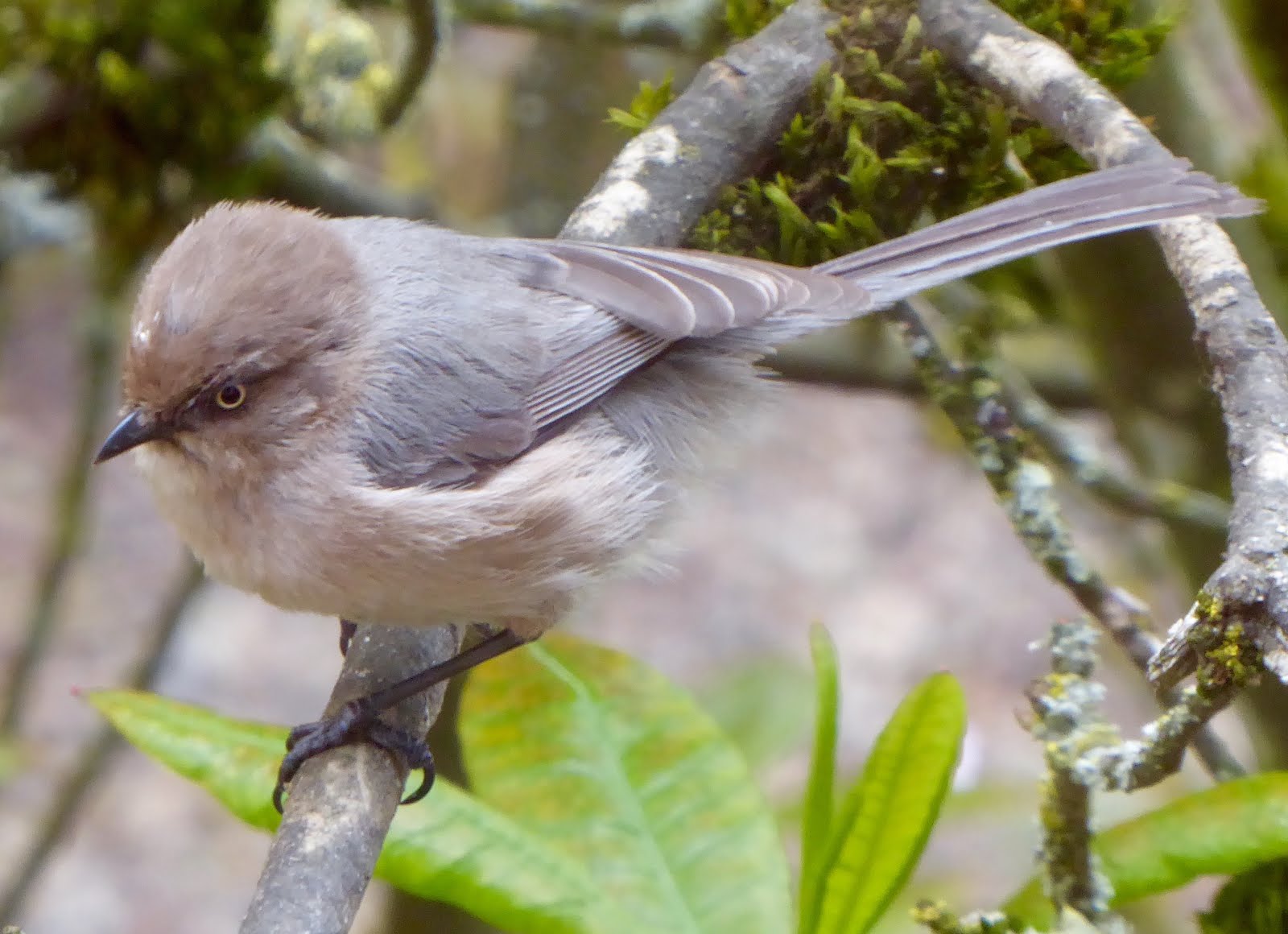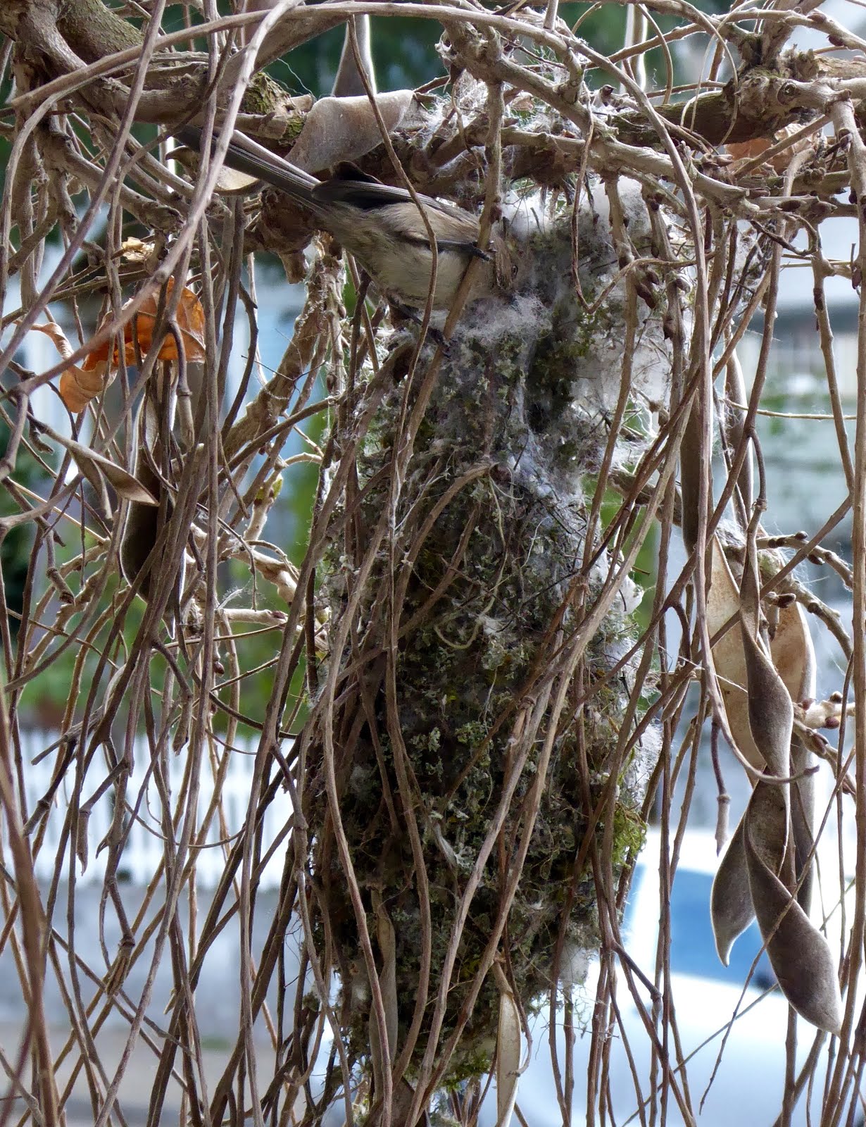 At the same time I’ve been holding my breath waiting for a friend to recover from COVID-19, I’ve felt nothing but honored that, purely by chance, I have a front row seat to the creation of a new batch of bushtits. Front row, hell–I’m sitting on the stage! Right in front of us we’ve watched over the past month as Chip and Mitzi Vinebustle have painstakingly fashioned their nest-sock out of spiderweb and moss and hustle. It was finally finished about a week ago. The flurry of activity had stopped. I thought the Vinebustles were out grocery-shopping and I got curious about their sock, so I leaned over the railing–it’s only a foot away–and brought my eye next to the entry hole at the top, and Mitzi up and blasted out of there right now. Sorry! I won’t do it again! Oh dear. Poor little button. I backed way off, of course. I’m thinking eggs have happened.