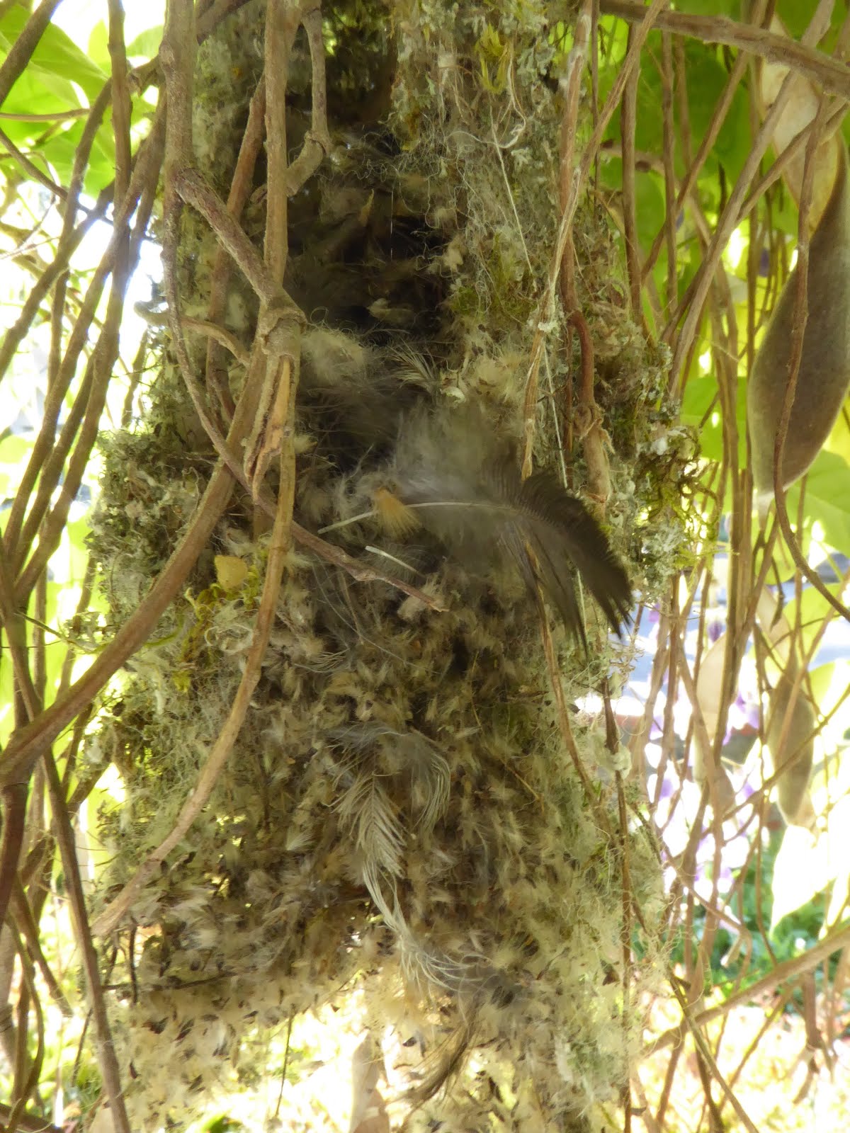 It had occurred to me that the nest might be in range of a cat on our railing, and I’d had the notion to jumble chicken wire on the railing if I saw a cat stalking the Vinebustles, but I hadn’t done it. The neighbor’s cat noticed the peeping from the song sparrow nest under a shrub last year and dispatched them before I’d found something to fence it out. I don’t know why I wasn’t proactive this time around.