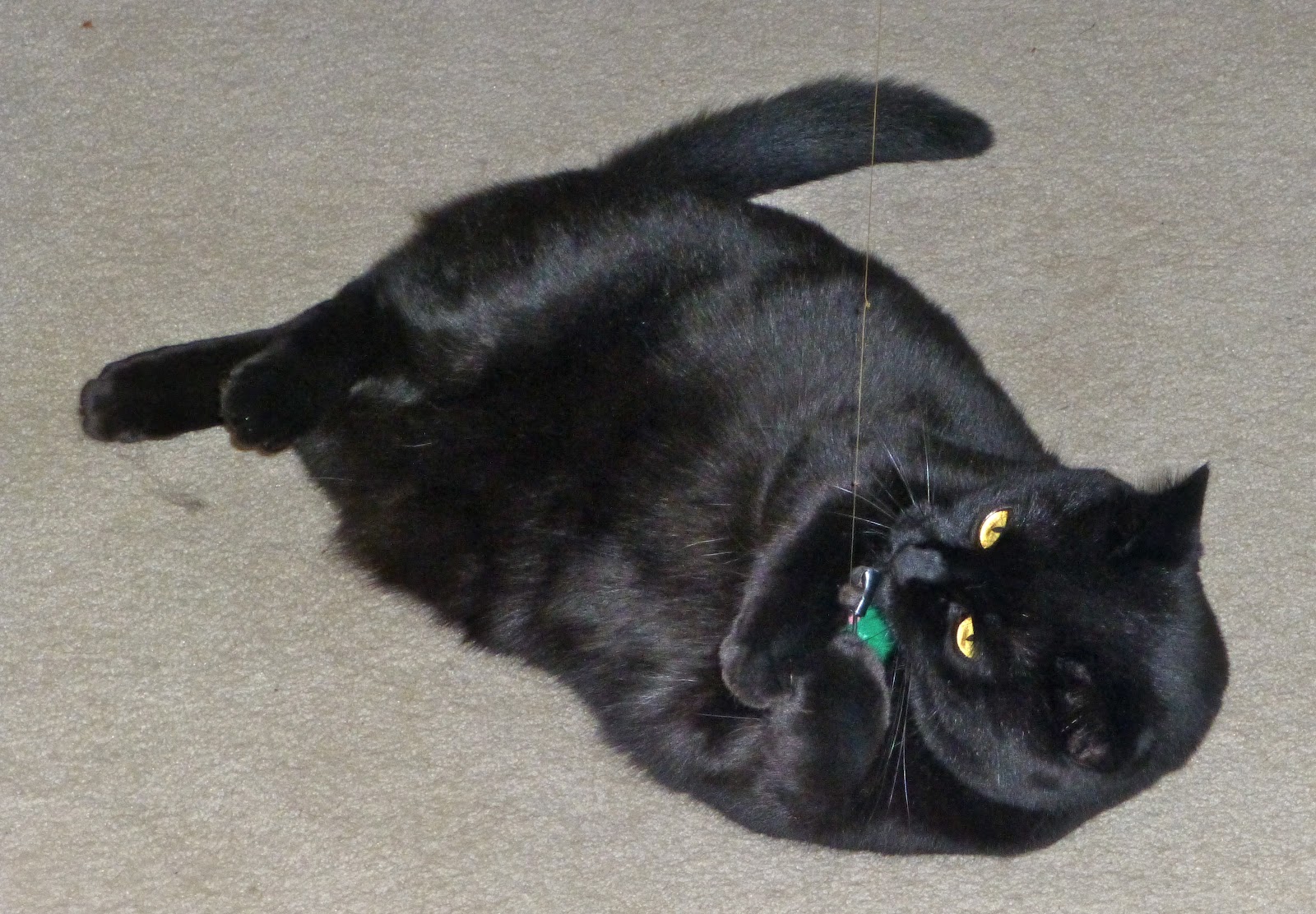 Our cat Tater might well be interested in anything that would make communication easier. She thinks she lives with The Stupids. Every day she asks for the exact same thing and half the time we act like we don’t know what she’s talking about. She would like to play with Mr. Greenjeans. Mr. Greenjeans is one of several rattle-mice she plays with (along with Orange Slice, Goldie, and Professor Plum), only Mr. Greenjeans is attached to a stick with fishing line and we can cast it back and forth for her to stalk and catch. Generally speaking she gives him a good pounce right off the bat and then after that it’s all stalking. There you are, flinging the little green mouse back and forth for twenty minutes, and she’s all hunkered down watching him. From the human standpoint, there’s not a lot of reward, and so she doesn’t get to play it as often as she wants to, which is every minute.