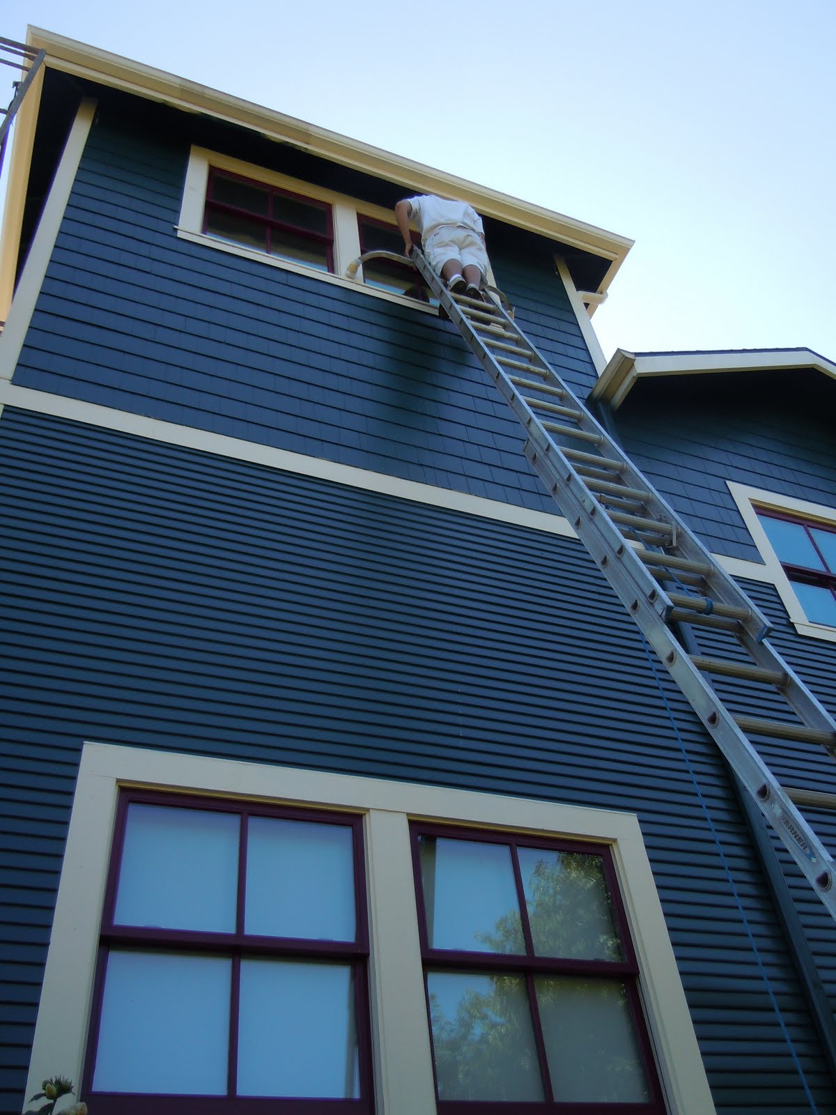 It looks like the guy up that terribly long ladder is one of the hired guys so then I started wondering if they even used Dave's scaffolding. I should think it wouldn't be too difficult to change one's attitude when it comes to painting a 2-story house. I guess 3-stories with the tower. Hiking is much better for the soul.