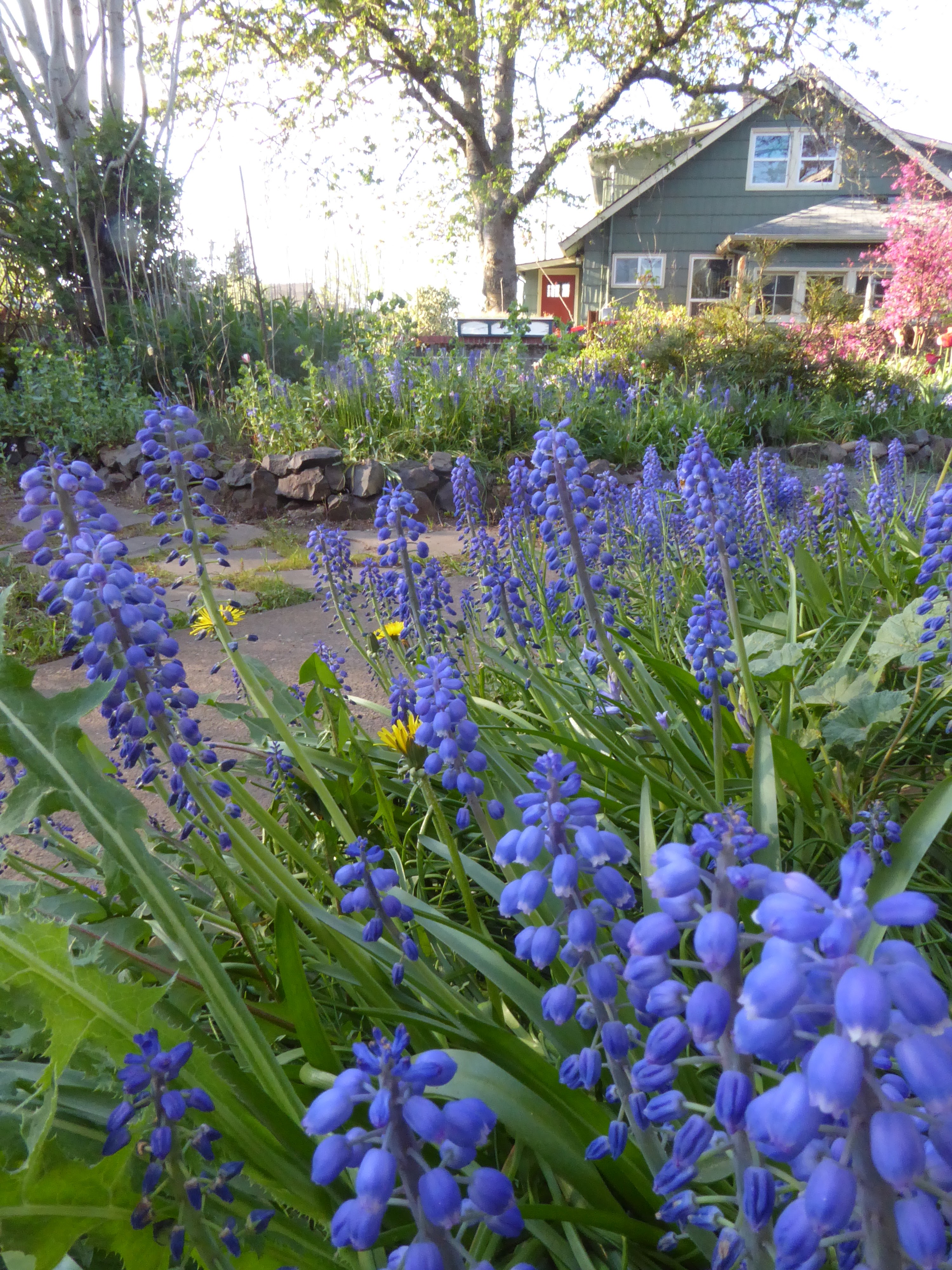 Meanwhile a number of things are conducting springtime in their own fashion without my input. For instance, I have grape hyacinths. There is such a thing as too much of a good thing. And there is definitely such a thing as too many grape hyacinths. They are a rolling blue tide thundering through the soilscape and lapping up against the walkways and how anything else wheedles its way through the mass of bulbs, NONE of which I planted, I will never know. I begin yarding them out by the bucketloads year after year, starting before they even bloom, and it does not slow them down one bit, because Jesus loaves-and-fishes them till Kingdom Come.