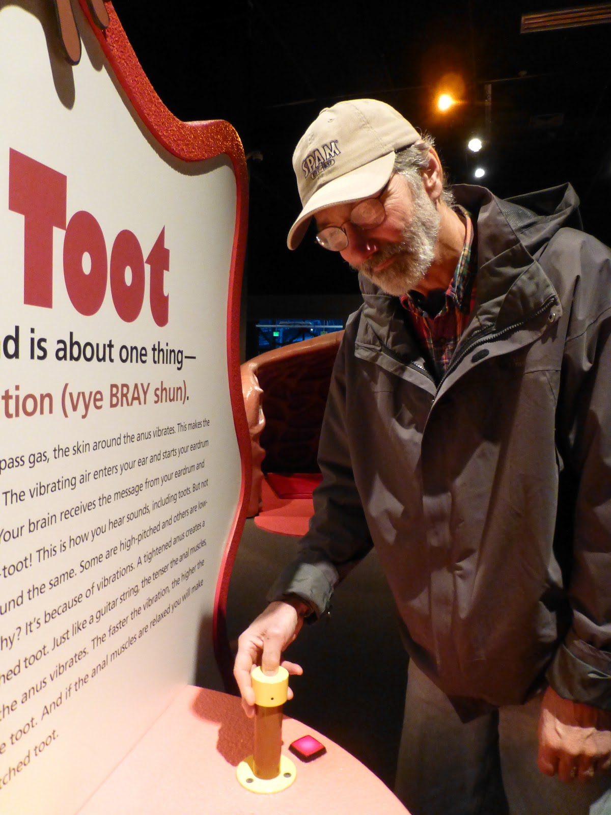 But the star attraction was the flatulence display. Here a group of avid youngsters was allowed to play with a series of stretchy rubber gaskets mounted on air tubes, and they were encouraged to regulate the air and stretchiness to produce the grand human fart repertoire: the splendid variety of fart noises we are capable of, depending on embouchure, tension, volume, and pressure. I felt encouraged for America. These were our future scientists! Or possibly postal employees. Either way, proud.