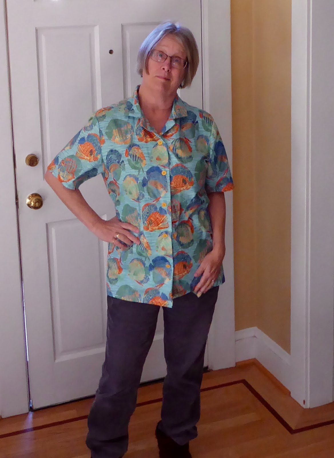 I couldn’t bear to drive all the way to the fabric store for only four buttons, so I bought a shirt pattern and some yardage too so the gas wouldn’t have been wasted. (This is true.) It was a simple style. I’ve made a couple hundred similar shirts for Dave and although he and I have way different topography, I thought this should be a snap.