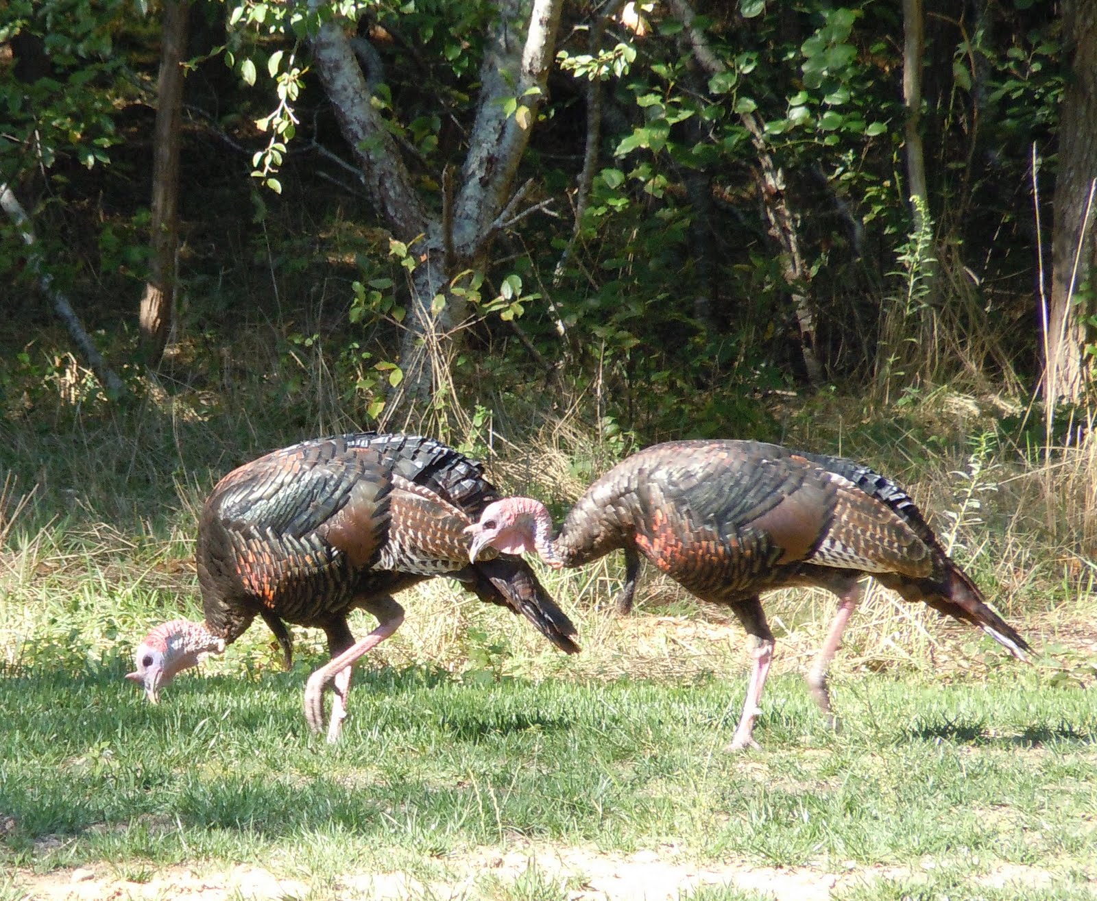A small wedge of that splendor is available to anyone willing to pay attention, and another wafer to anyone willing to pay for binoculars. The heads of hummingbirds ripple with their sipping tongues. Life, death, tragedy and romance play out under a single leaf. It occurs to me, as my personal clamor subsides and gives way to the natural music, that meteors are slicing through the sunny sky right then and there, joining the list of marvels outside my narrow perception. I register a scant movement in my periphery and turn, and the forest begins to extrude hadrosaurs. One, two, three hadrosaurs leak out into the meadow in search of cracked corn–thank you, Linda–and resolve, upon further review, into turkeys, readily identifiable from the construction-paper versions we made in first grade, but the size of furniture. They are followed by ten more junior models and then they evaporate into the woods again.