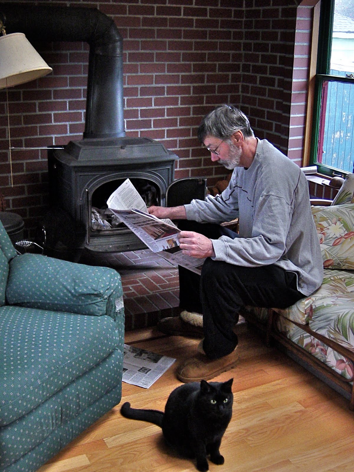 “How about a fire?” Dave says, heading for the woodstove, and I smile, knowing I’ll be toasty warm in–oh, forty-five minutes to an hour. The wood is already in, and the kindling chopped. Where everything jams up is the newspaper-crumbling. There is no sheet of newspaper, which Dave has theoretically already read, on which he cannot find something new to pique his interest. There’s someone in the obituaries named Gladys who was only twenty-one; some guy thinks he can get a half-mil for the crappy store-front down the street; the entire east coast is graphically covered in raindrops. I get up and put on a sweater, and return to find out that Safeway is selling Fuji apples for 89 cents a pound, and it’s still cold in the kitchen. We call this “reading the fire.”