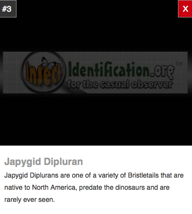 Then I saw the image of Japygid diplurian. The whole image was entirely black. The Japygid diplurian is so rarely seen that they didn’t have a picture of it, so it was probably my bug. And what a wonderful bug it was! The Japygid diplurian, it says here, even predated the dinosaurs. You get a bug that size that eats dinosaurs, you’ve got yourself a champion. They say the dinosaurs got wiped out by an asteroid, but it totally might have been the clothesline bugs. Awesome.