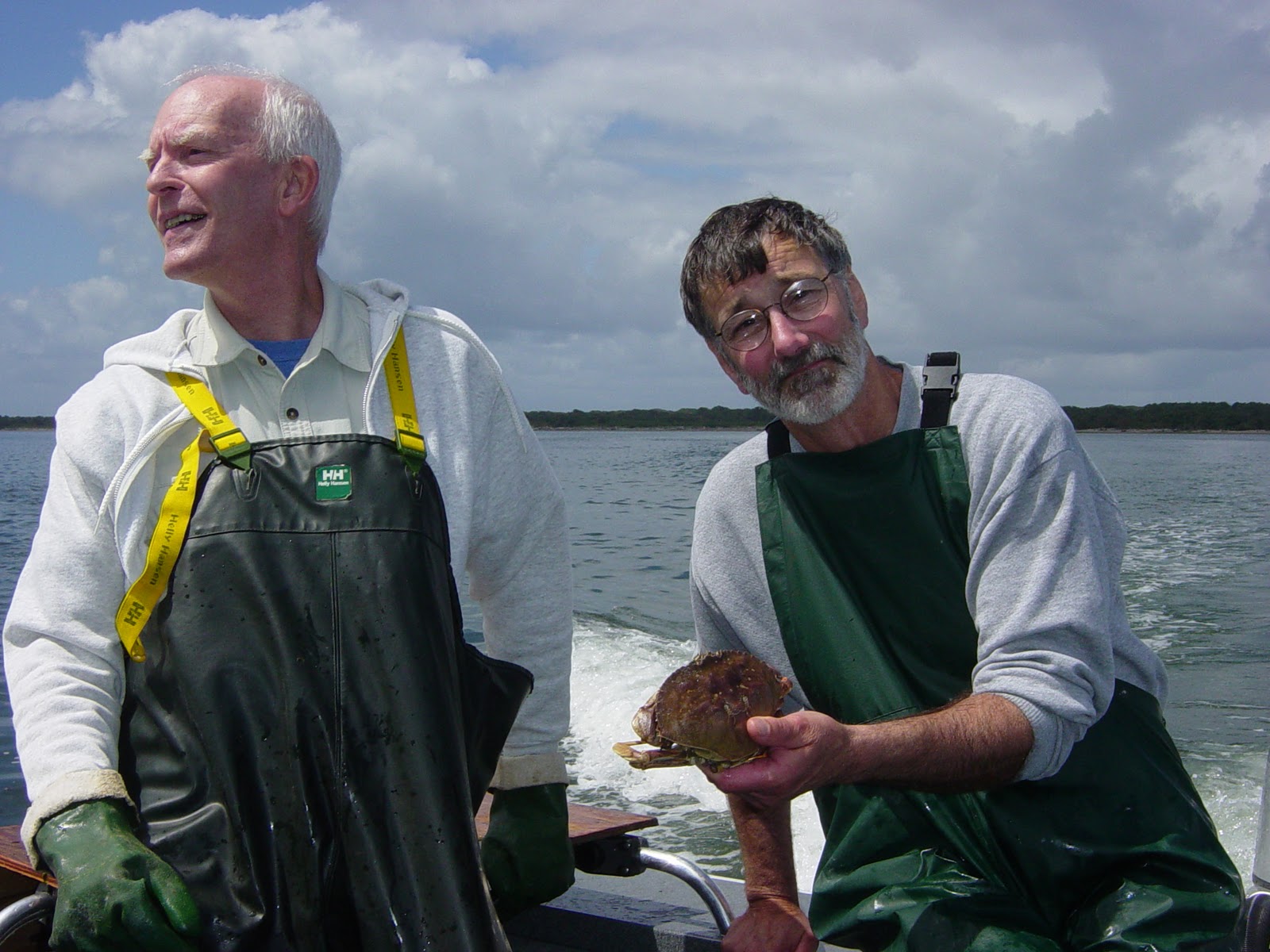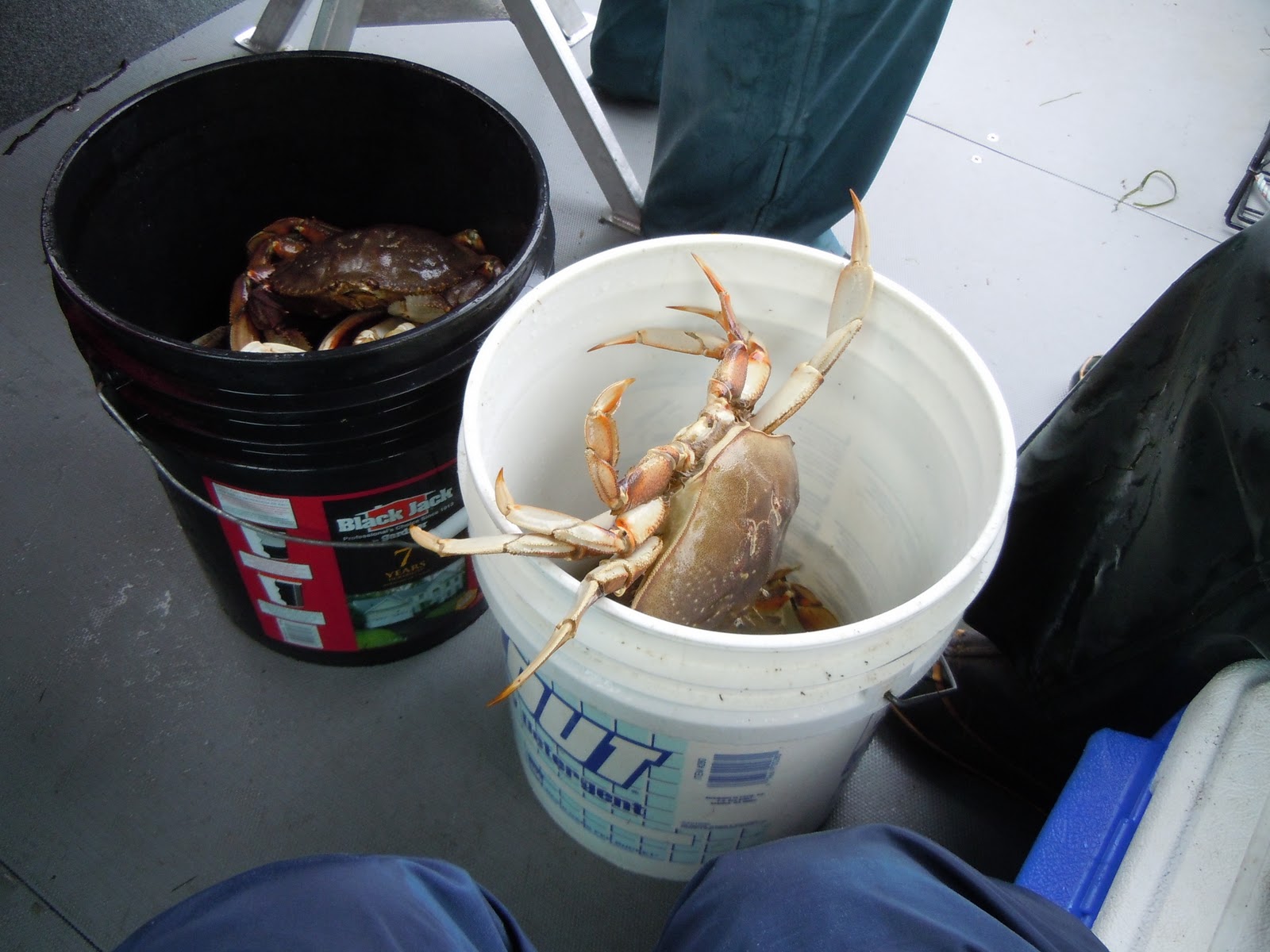The agenda was to put in seven crab-pots first thing in the morning as the tide comes in, then fish for a few hours until it’s time to pick up the pots. Dave loves picking up the pots. He likes nothing better than to reel up a pot heavy enough to engage the stomach muscles, haul it aboard, and begin sorting through a frightening melee of crustaceans that might, at any time, separate him from his thumb. It’s like sticking your hand into a vat of knives. What fun!