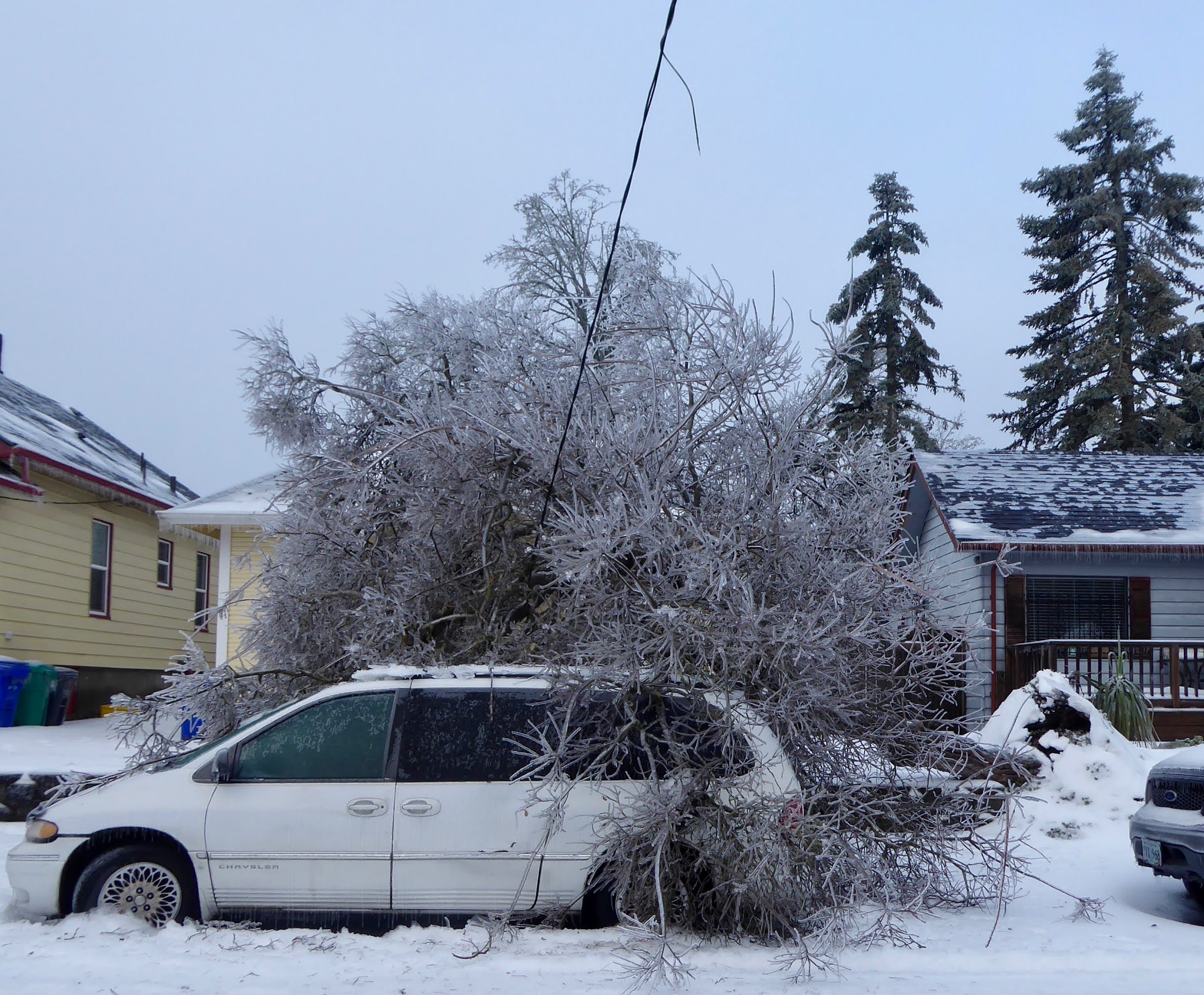 The next morning, as we blundered out in the sunshine to the sound of general artillery as the neighborhood shook off its ice, the mystery was solved. As it would have been the night before if I’d put on my glasses. A large tree had fallen down, across the street. On a car.