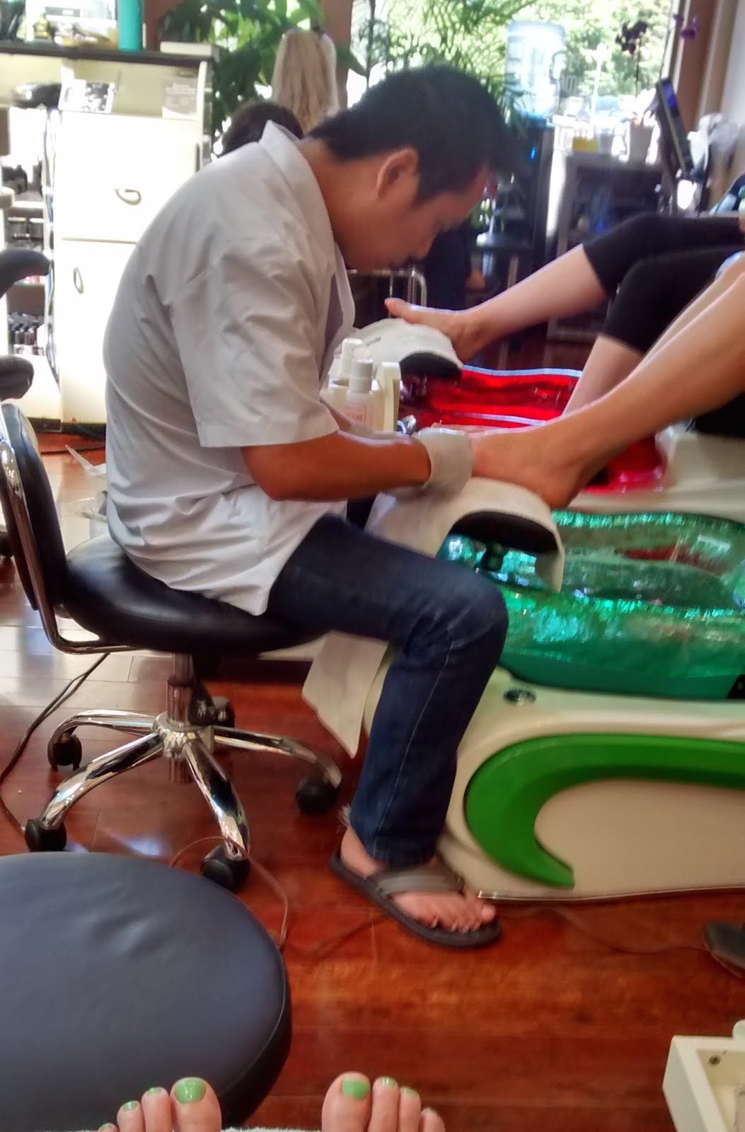Oh golly. I get pedicures intermittently, usually before I go on a warm-weather vacation where there will be time on the pool-deck. You see, there is nothing less attractive than a slightly-overweight middle-aged gay man with ugly feet. Sometimes, I have to get the pedicure after I arrive at my destination — this leaves me vulnerable to the skill level of unknown pedicurists. Once in Miami Beach, I encountered a voluptuous woman, probably more related to Charo (https://en.wikipedia.org/wiki/Charo) than your Asian cardiovascular surgeon pedicurist. She took one look at my cracked heels and callused toes, and reached for her little valise with….Power Tools! On the bottoms of my feet, she used a tool that was clearly a scaled-down disk-sander. On my cuticles, she use a Dremel Drill with foot pedal speed control and multiple attachments….and quite frankly I forget the third power tool….Another time, the pedicurist took one look at my feet, escorted me to a private area of the salon, and joyfully announced that "This is a job for the Potato Peeler". Which means that for over 30 minutes, she wielded an (illegal)razor in a special holder, and gently shaved my calluses into a pile of little bits that looked like crumpled onion skin…..But, back to you — will you go again, just for the pampering and the leg massage?
