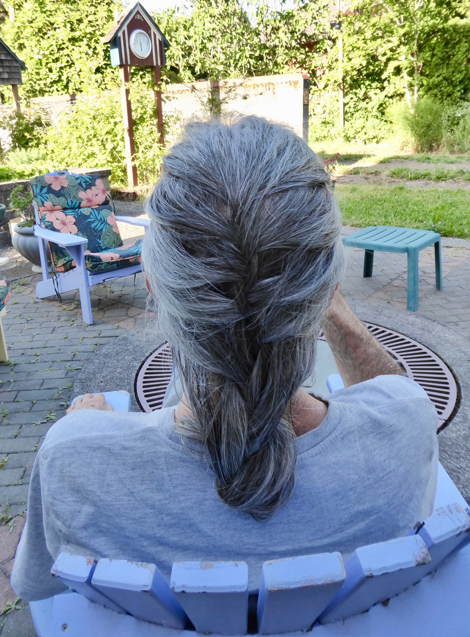 I just snuck up behind him and did a French braid, which is how I wore my hair for a long time. He didn't like it. He's not fancy. And it just curls under like that naturally.
