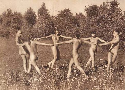 I'd've taken a guess, based on the sepia tone and the long blond hair of one of the cavorters (what, spellcheck? WHAT?? You'd prefer cavortees?!?), that the middle picture IS of your group. Then again, the menfolk don't seem to have enough, or long-enough, head hair to make that guess feasible. Still, would you 'fess up if that WAS your blond tush romping in the fields?