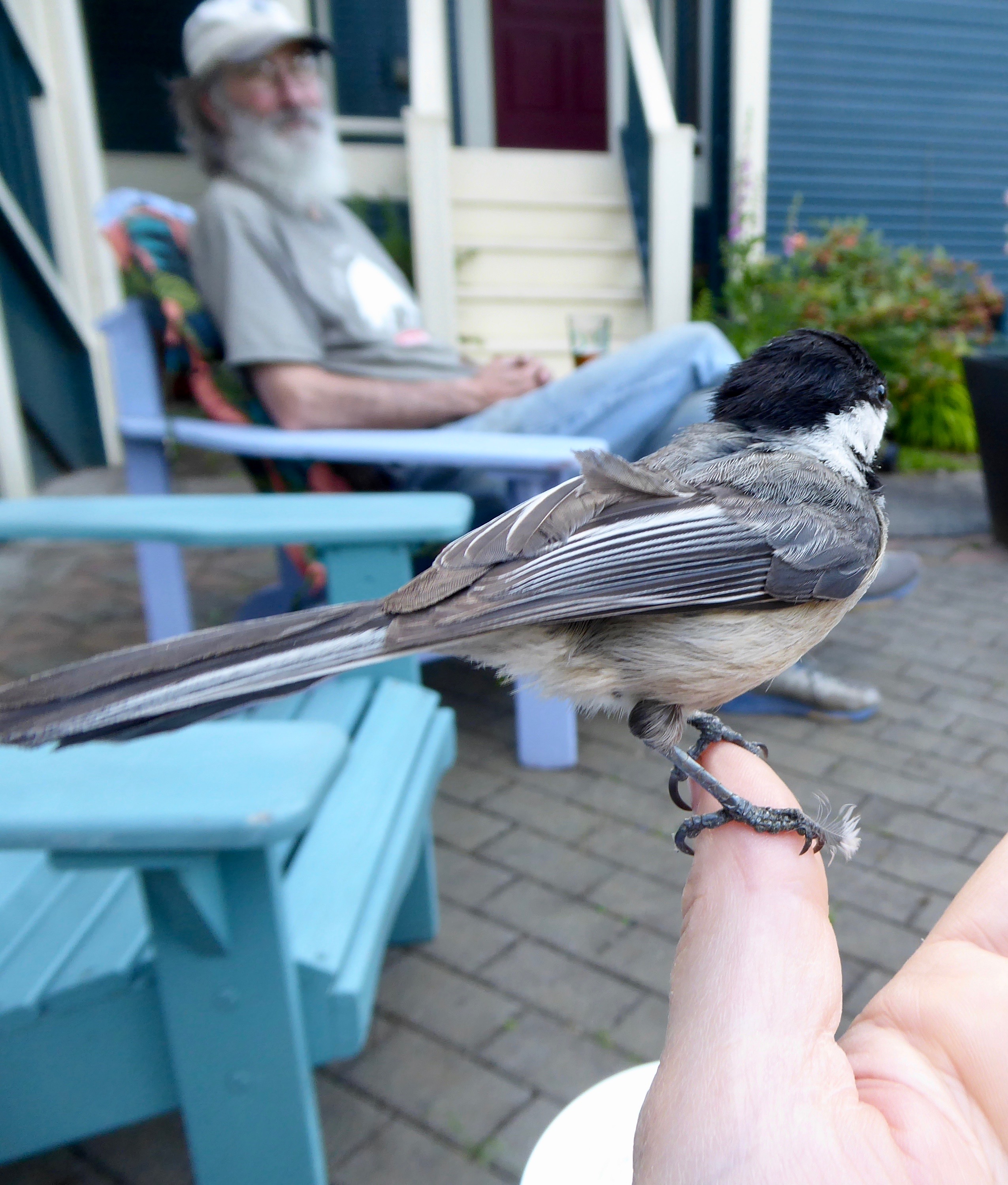 Then Studley came back with three of his little guys in tow! They’re not any littler than he is, of course, but they’re beebling away in the trees waiting for Daddy to show up with snacks, and we couldn’t be relieveder. They too can be recognized by their shiny new suits and I do believe they outweigh their father too, because as usual he has worked himself skinny. His molt will start any day now. Last year by this time he had a ragged cheek bib and a bald spot on his head. This year his head feathers look okay but he’s had this one feather sticking up on his back for weeks. I tried to smooth it down once but Studley has stopped just short of allowing me to touch him in a personal fingery way. And I know this because it’s everything I can do to keep from chucking the little dude under the chin.