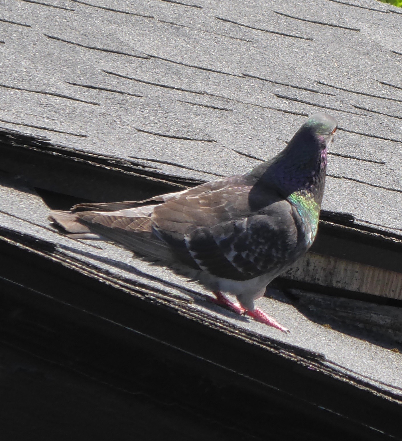 And so I’m happy that I’ve made my garden a destination resort for the feathered set, and contemplate what more I can provide, because birds are awesome in every way, but I would like to mention that I the hell did not mean I wanted freaking pigeons nesting under my solar panels with their stupid breathy cooing like they’re fat little Olivia Newton-Johns in a world of opera stars and all walking around like they do with their tiny stupid heads poinking along behind them like they’re trying to catch up to their own plumpety bodies. But there they are flapping down to the rental house’s gutter and coming back up to our roof with big old sticks because not only do we have freaking pigeons committing lavish poopination under our solar panels but sure enough we didn’t get around to clearing out the gutters last season and thanks for reminding us.