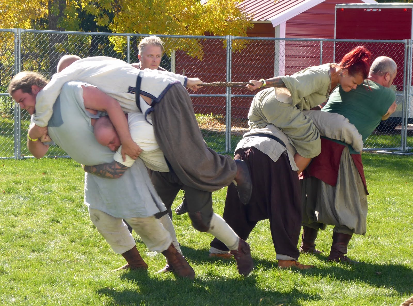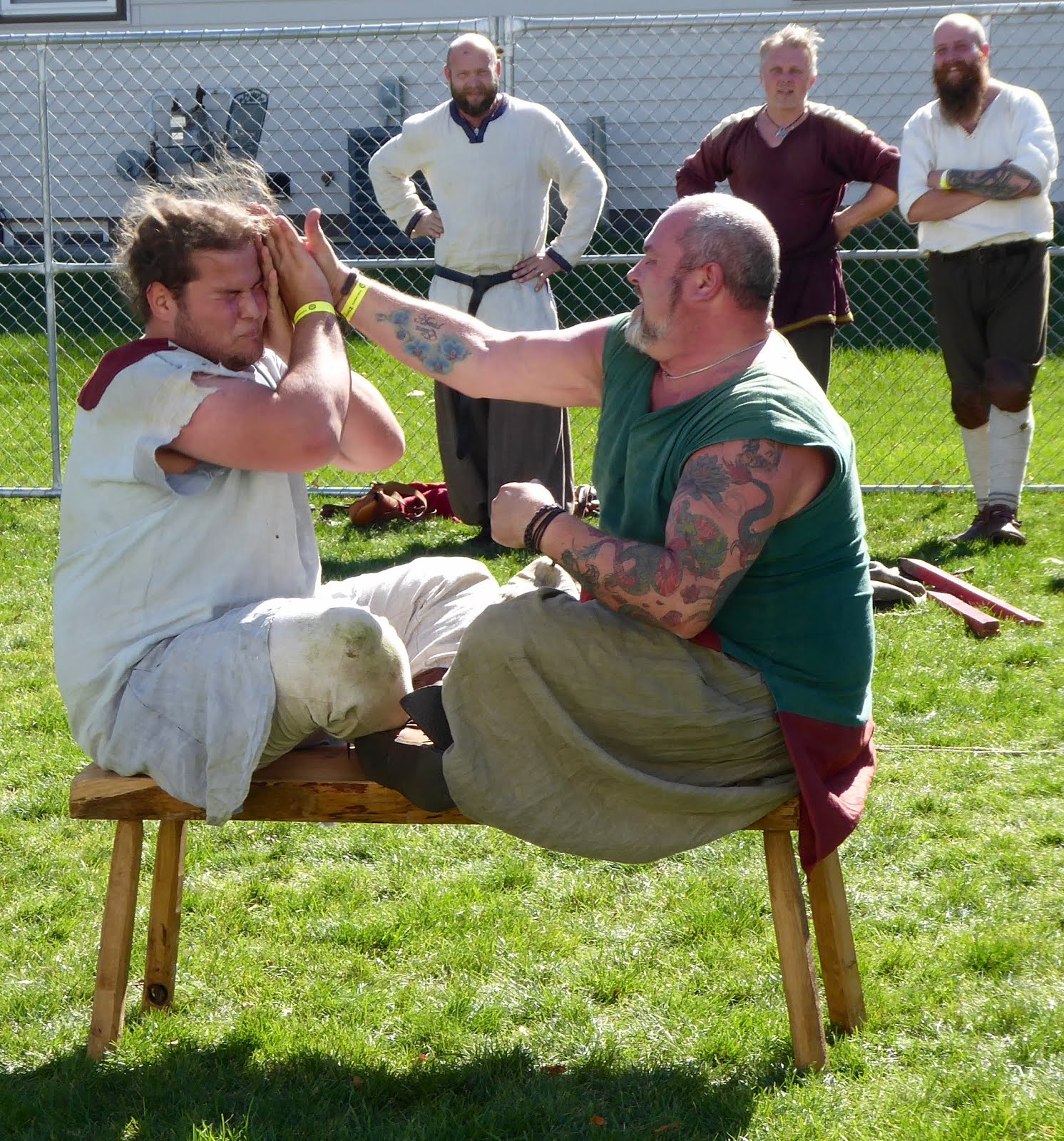 The Vikings who survived being cleft down the middle, or who were pre-cloven, also displayed their sunny side with games of all sorts. All right, there was only one sort, with several versions. They involved one form or another of jumping on each other really hard, and then trying to pull each other apart. These games were done in teams, except for that one wherein two men sat cross-legged on a bench and took turns slapping each other into kingdom come, or off the bench, whichever came first. Awesome. Winners of any given game celebrated with a mighty shout, a vestige of which remains to this day in modern Norwegians on bingo night.