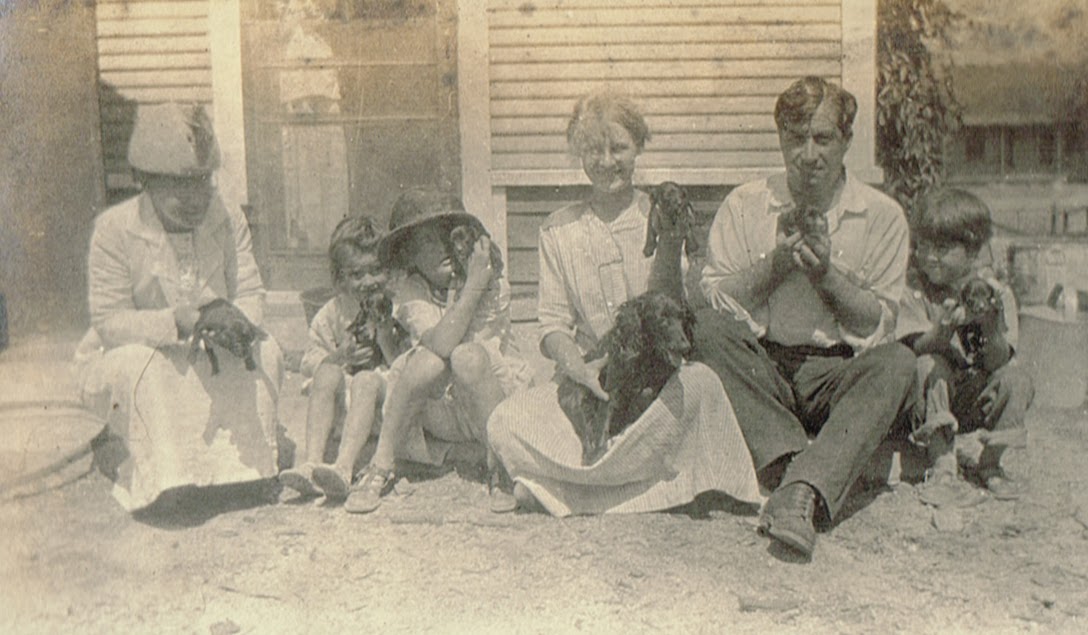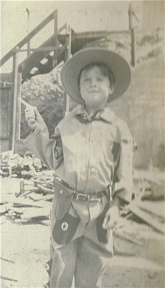 I have some very old photograph albums. My father stars in one of them as a toddler, and he was beginning to toddle in 1909. All of the action takes place in Bisbee, Arizona, where his family had moved because his mom had the consumption and it was thought that the dry air would be salutary. It wasn’t. In the rare photos of her, she is bedridden and wan, with the long-suffering aspect of a poet, which she was. She managed to eke out three children and a group of poems and then withered away. There are some surprises. Daddy is shown in a little cowboy outfit that looks just as fake as the ones kids wore fifty years later, and shoot–they probably had authentic cowboys moseying around then. Also, he had cocker spaniels and burros, and he only let me have a dang parakeet.