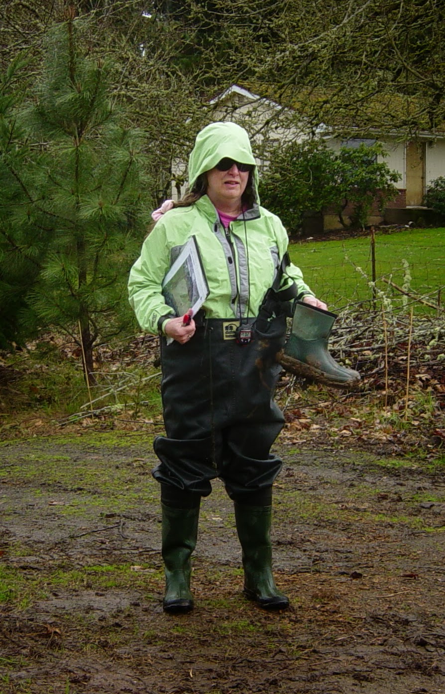 I don't have that many pictures of me in the rain. The light's not conducive I guess. So this one is of me on the way back from a Frog Egg Survey. You wear your boots down to the pond and switch to waders.