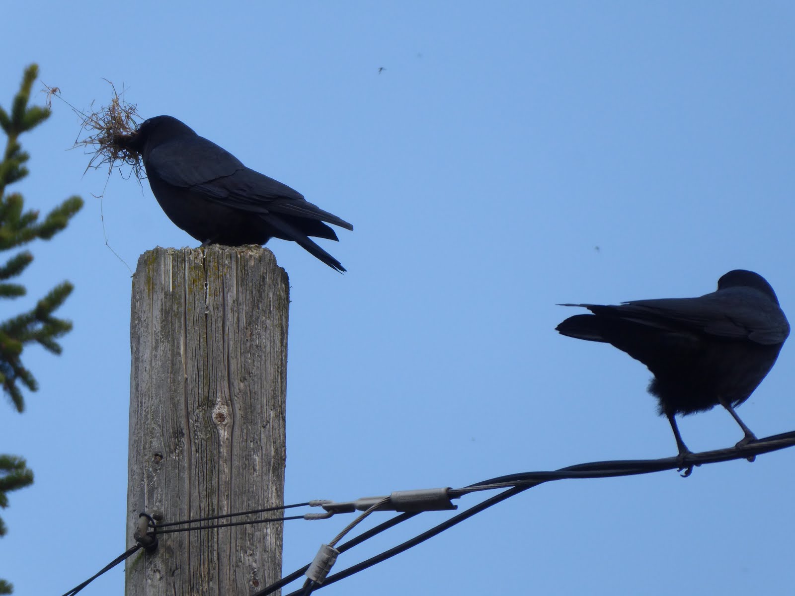 All these photos were taken in one twenty-minute outing in my yard, just after I finished typing this up. This is the first day I’ve seen crows with nesting material, and I’ve been looking. And then Studley showed up when I was trying to get a photo of a bumble bee. He wrecked that. All my bee photos were out of focus. If I had worries, I completely forgot about them.