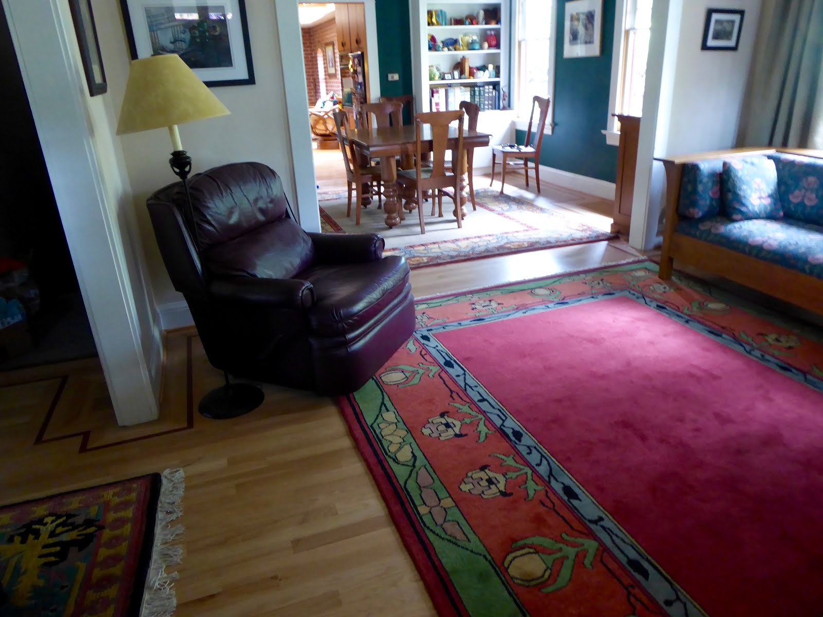 There are four rugs here. The red one is now folded up awaiting another Round Tuit when we re-do the TV room. In its place is the plainer rug in the last photo. It's plain but has Frank Lloyd Wright touches in the border.