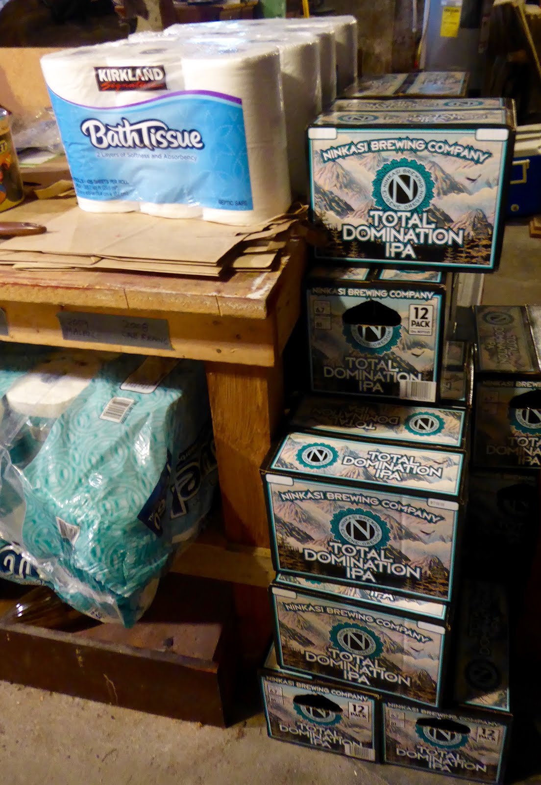 We should probably get a bucket with a toilet seat and dried food and a water filter and a first-aid kit and Handi-Wipes and peanut butter and a lantern and a space blanket and a Saint Bernard, but the lack of a lot of those things can be mitigated with beer. Oh and we’re also supposed to have some firearms to protect our stash from our, uh, friends and neighbors and people in need, but we aren’t planning to change party affiliation or anything, so no.