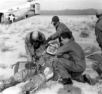 On his ultimate flight, he noticed a bit of a rip in his glove on the way up, considered aborting, and then, in words straight out of the space-pioneer handbook, he bellowed “oh, well” into the waning atmosphere and continued up to an altitude of 107,800 feet. By this time his hand had swelled up to the proportions of a Macy’s float and he had to complete his descent with one hand tucked into the opposite armpit.