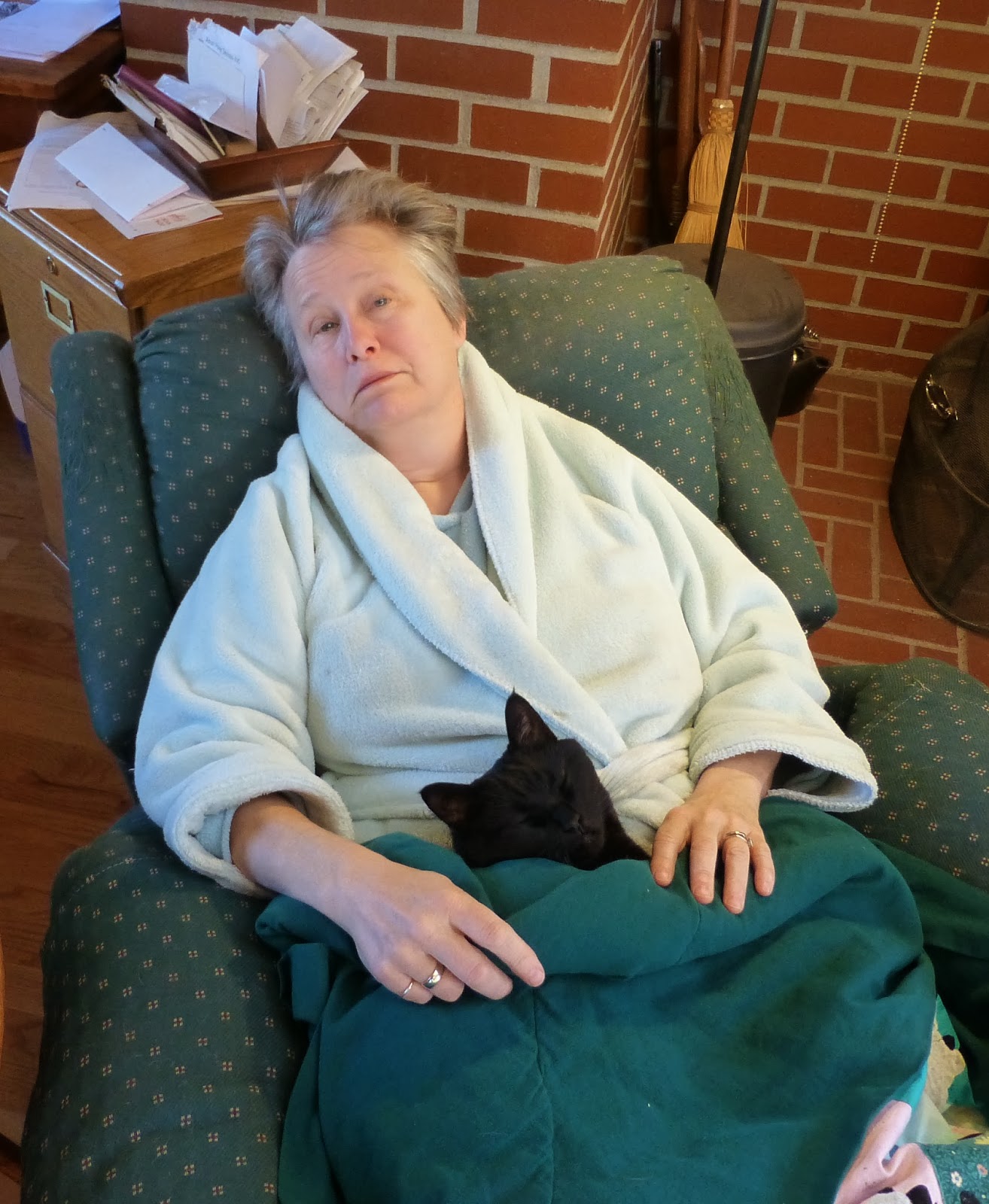 Not sick sick. Just one of my peculiar colds in which the symptoms occur all out of order or maybe some of them don’t manifest at all. In this case, I developed a blatting baritone that was only minimally sexy and began to want to cough recreationally most of the time. No sore throat. No congestion. It was merely annoying until the third night, when a little fever crept in. At that point I holed up in a comfy chair with a blankie over me and churned out heat for the lap cat. Dave poured me a beer and I soldiered through it.