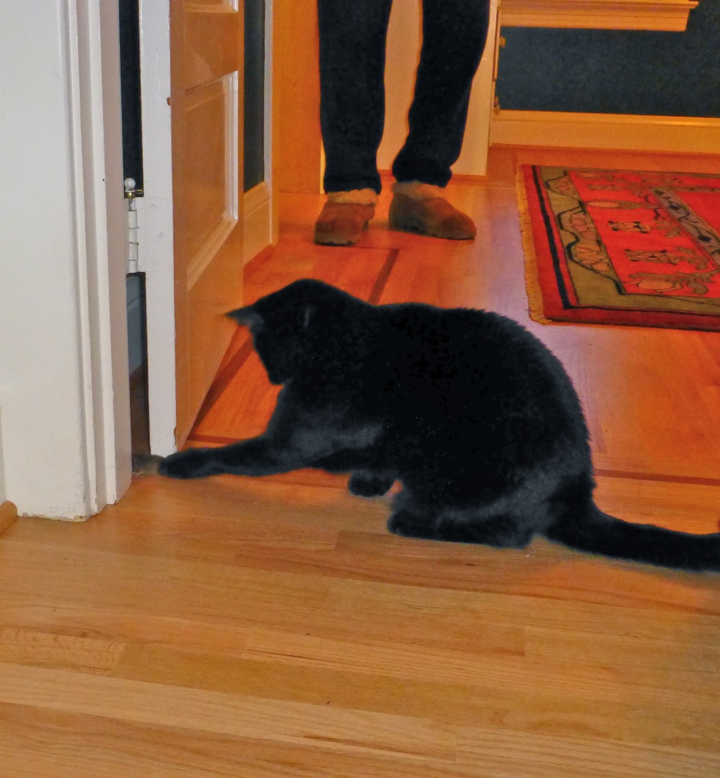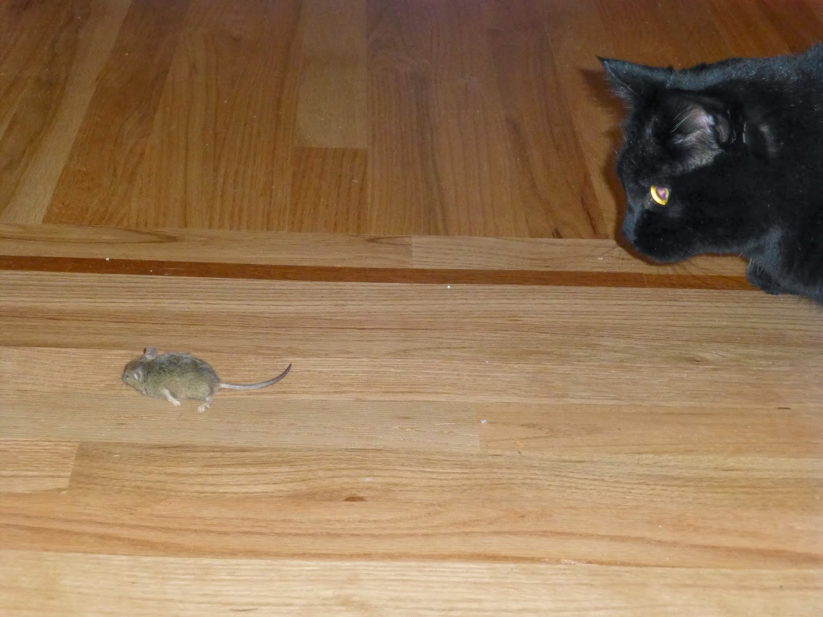 But later, there she was with it. She’d gotten it back, and this time she had done something instinctual to it, and it was a much reduced rodent. Battable. And she batted it under the door. Went to the other side and batted it back. We let her keep this up for a couple minutes before Dave intervened to dispatch the poor critter.