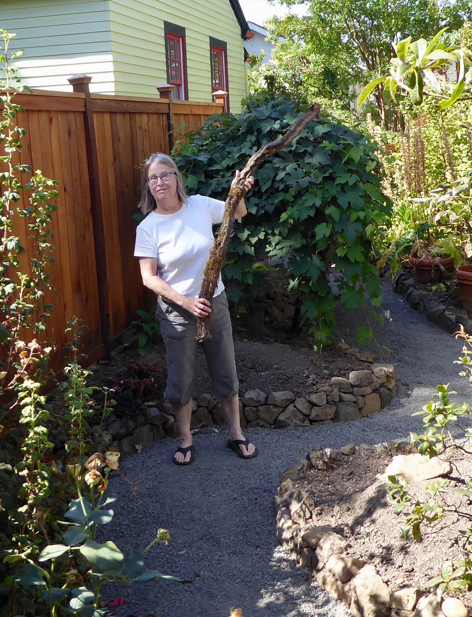 I’ve had rock-lined gravel paths in my garden going on thirty-plus years now and they’ve held up pretty well, but what with one thing and a roofer, a painter, a toppled tree, a fence-builder, and another, things have gotten a little wonky. I finally bit the bullet and decided to rebuild the whole thing from scratch. And change the trajectory as long as I’m at it. We took down the grape trellis Dave built a thousand years ago since there was nothing holding it up but possum pee and a conspiracy of mosses. Now I think I’ll narrow the path where the trellis used to be and get some more garden space. So. What to do with the Root?