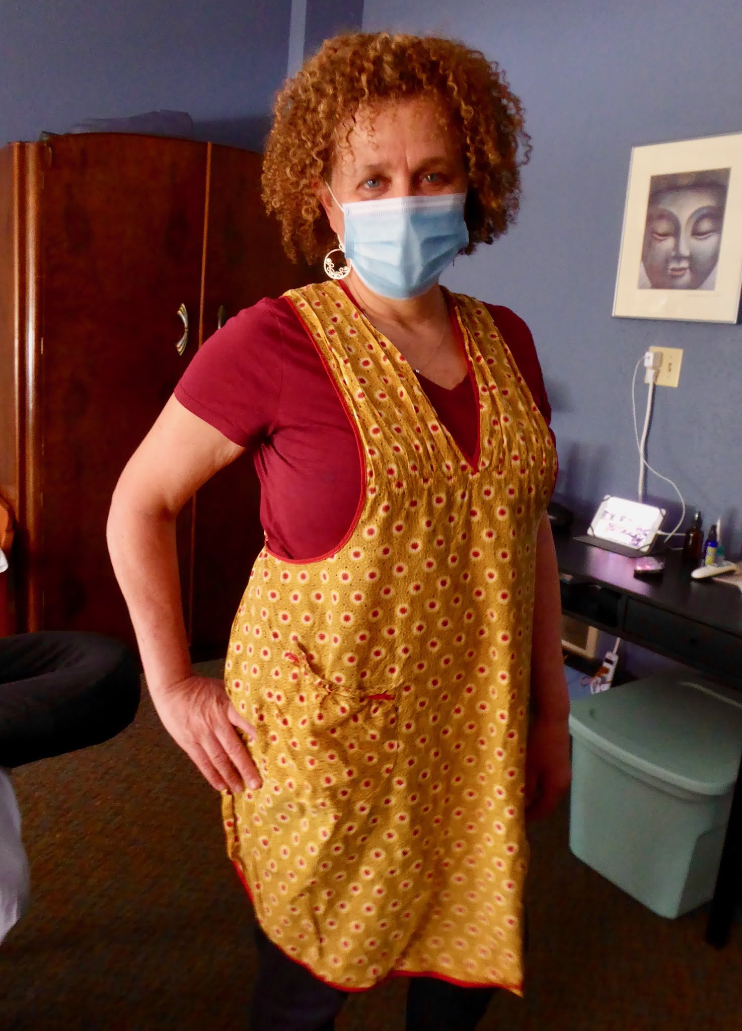 This apron is old. This apron was pieced together by candlelight using scraps from Granny Mae’s Sunday-go-to-meetin’ calico. It has now been worn quite a bit by our ace massage therapist and is saturated to gumminess with fragrant oils, and if a modern person raised on hormone-infused dairy products and hybridized wheat so much as breathes on it, it will fall into lint. Also, it is piped. Narrowly. A raw edge is covered in 1/4-inch bias tape, and it will spontaneously unravel in direct sunshine.