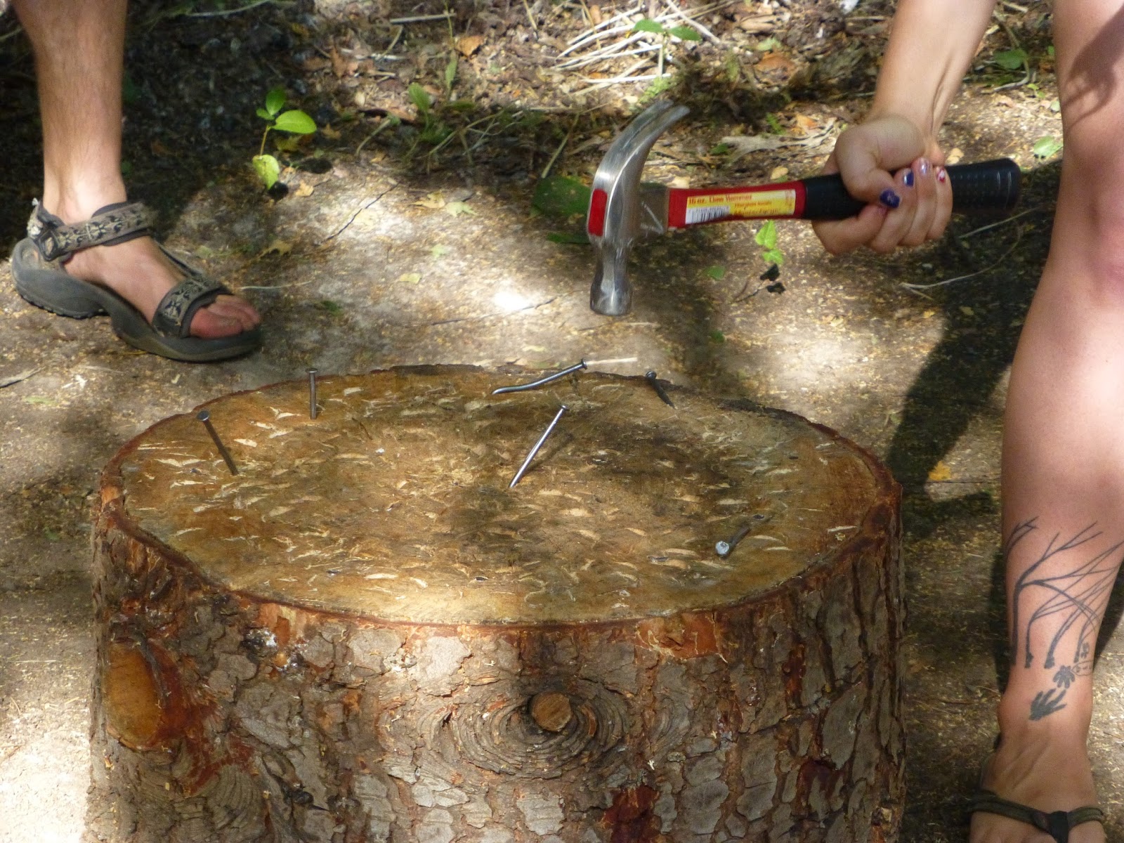 I arrived in flip-flops, confident I would be required to stay as far away from the hammers as possible. There were three stumps set up and about two dozen players. Everyone had a nail, everyone had a beer. Odds were good something was going to get hammered. Everyone took a position on a stump and the tools began to fly. There are stylistic differences in hammer-tossing technique, but it is particularly important not to be caught cocking it, even a little. Nobody wants to be subjected to mild disapproval for a teeny cock. And failure to observe any of the rules subjected the