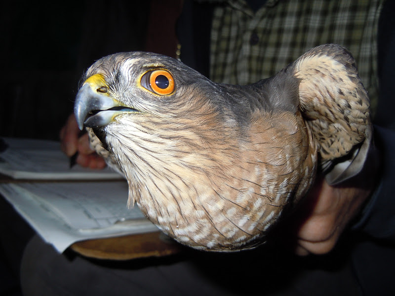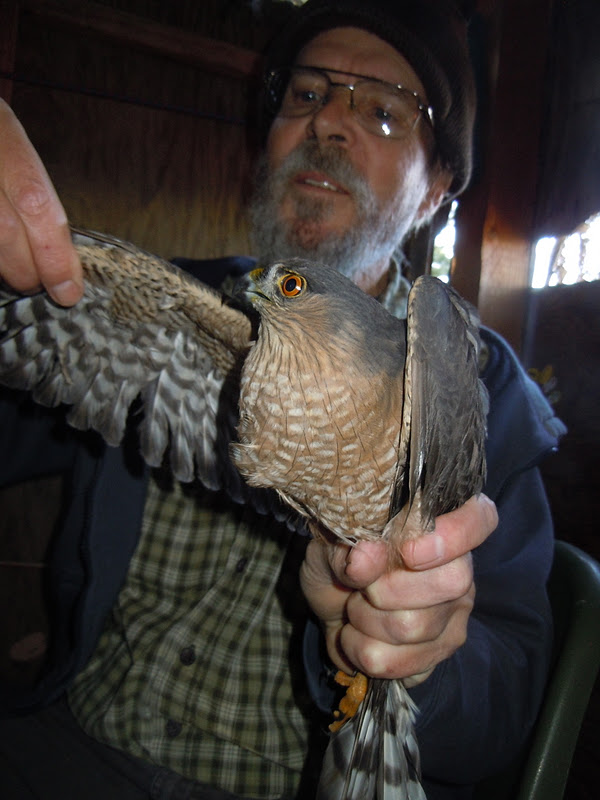 The Sharpie looks docile because he's been caught. They go into kind of a trance and are amazingly cooperative. Course the moment you release them into the sky they let loose, quite literally, because you've no doubt just scared the shit out of them!