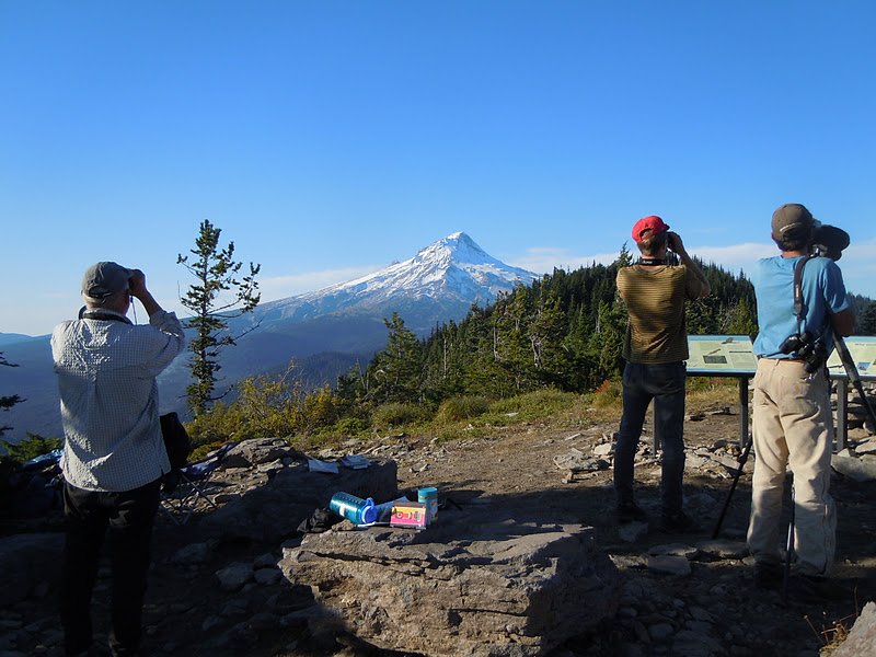 So when Dave read about Bonney Butte, a prominence on Mt. Hood at which the fall migration of raptors is particularly splendid, we went to see. Here the selection of birds was likely to be contained in three pages of the guide books, and we thought we’d have a good chance of being able to identify them. Just to get in the mood, we attempted to reach the place using directions off the internet. They were very specific, advising us to “make a sharp left at 6.8 miles on a rutted road you’re too liberal to have a vehicle with high enough clearance for.” They called it “unsigned Road 4890,” and it looked pretty much like every other unsigned road–no identifying marks, indistinct plumage, and no particular correlation to the mileage indicated. I’ve been following hiking guides for a long time now, and I am not fooled by this sort of precision. 6.8 miles can mean 7.2 miles or 4.6 miles, or, in some cases, it can mean–ha ha!–that there is no road at all. Sometimes this is a result of deliberate sabotage, and sometimes it means the writer of the hiking guide had a very nice hike and tried to estimate, back home after the fifth beer, about how far down the road that particular turn-off was.